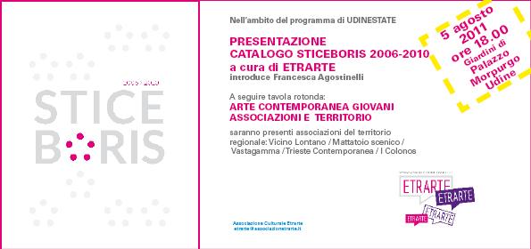 Un vero e proprio traguardo quello raggiunto dall’associazione culturale ETRARTE – Gloria Deganutti, Elena Tammaro, Raffaella Garzitto e Valeria Lorito - che dopo 6 anni di promozione del contemporaneo regionale, presenta il catalogo “ Sticeboris 2006-2010" : documentazione completa che racchiude la progettualità di un quinquennio della Rassegna Sticeboris, ideata come spazio indipendente e palestra artistica per i giovani talenti del Friuli Venezia Giulia. 63 gli artisti presenti, molti dei quali hanno ottenuto riconoscimenti internazionali. 176 pagine con traduzione a fronte inglese. Oltre 100 immagini a colori. Un volume di alta qualità che riunisce la realtà creativa regionale tra pittura, fotografia, scultura, installazione, video, illustrazione, grafica e street art. Una testimonianza diretta di come i confini territoriali possano non limitare ma accogliere, stimolare e valorizzare il linguaggio artistico contemporaneo in costante evoluzione. Corredano e completano questo documento gli interventi della critica d’arte Francesca Agostinelli, che ha curato la prefazione, del giornalista Rai Paolo Roncoletta e del critico cinematografico Carlo Gabershek con un prestigioso intervento critico storiografico su una delle sale espositive di Villa Beretta –Porcia Brugnera a Pavia di Udine, che fu set cinematografico della pellicola in lingua friulana, Maria Zef. La sala, dopo oltre vent’anni d’ oblio, è stata resa nuovamente visitabile proprio grazie all’intervento dell’Associazione Etrarte.