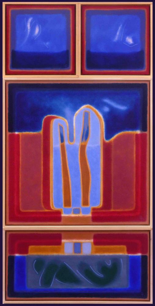 Questo quadrittico di Gaetano Fiore è solida struttura architettonica che permane nel fluire del tempo. Non mera coreografia né via di fuga e neppure illusorio trompe l’oeil su mondi ulteriori ma fittizi. Nell’opera si staglia il palazzo vivente di un giardino, chiostro e orto.