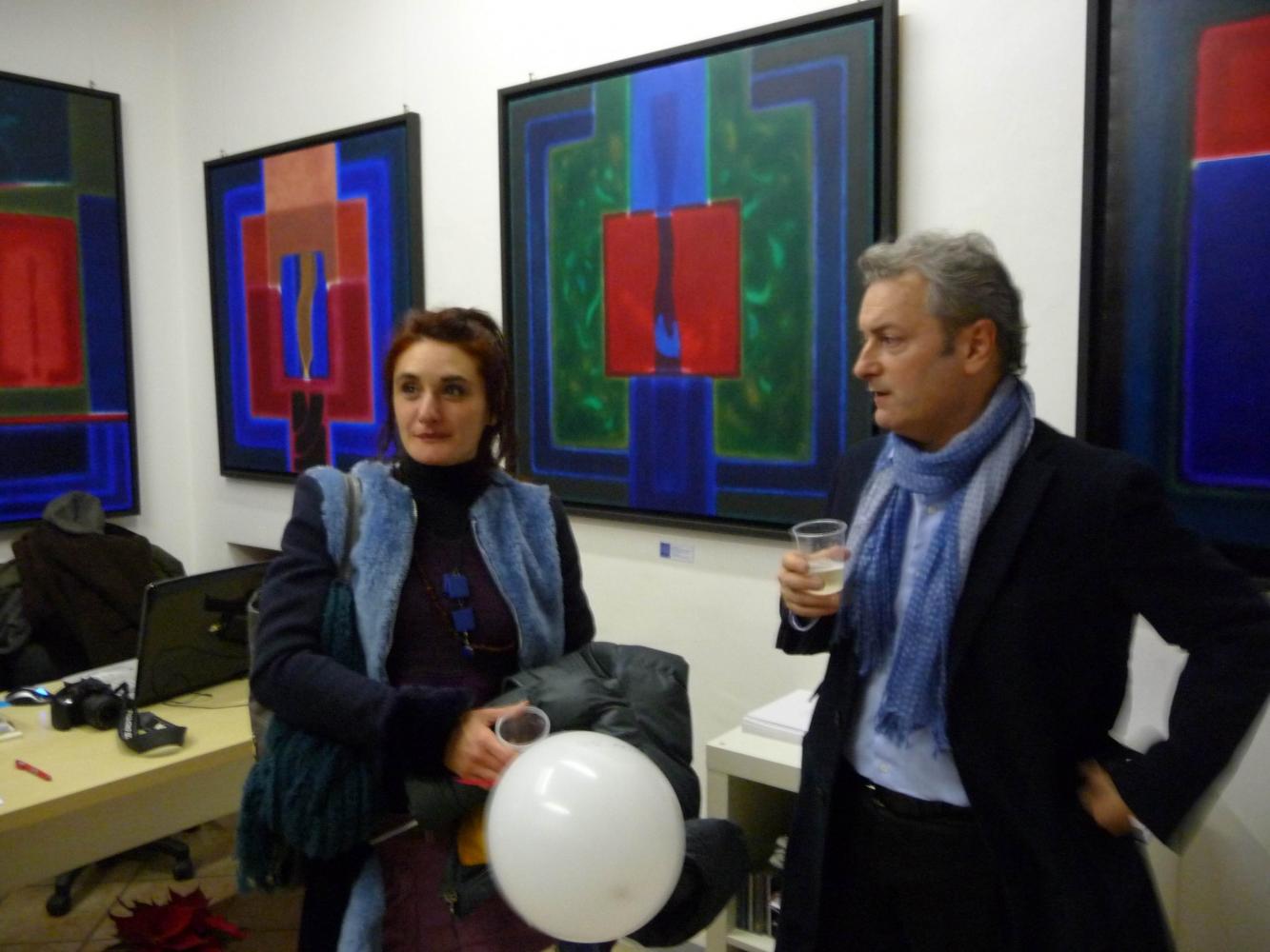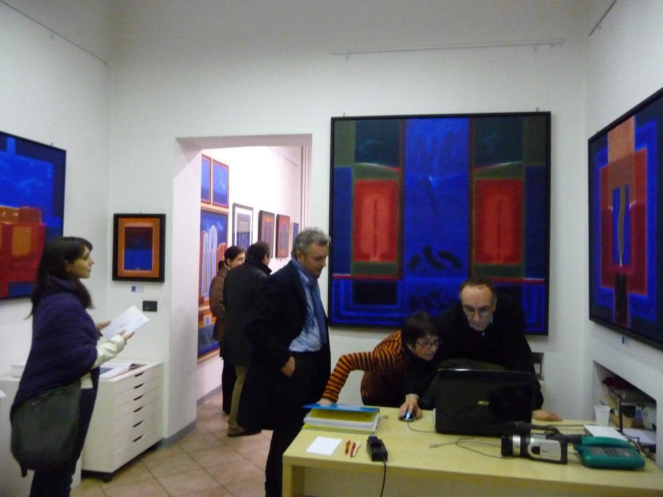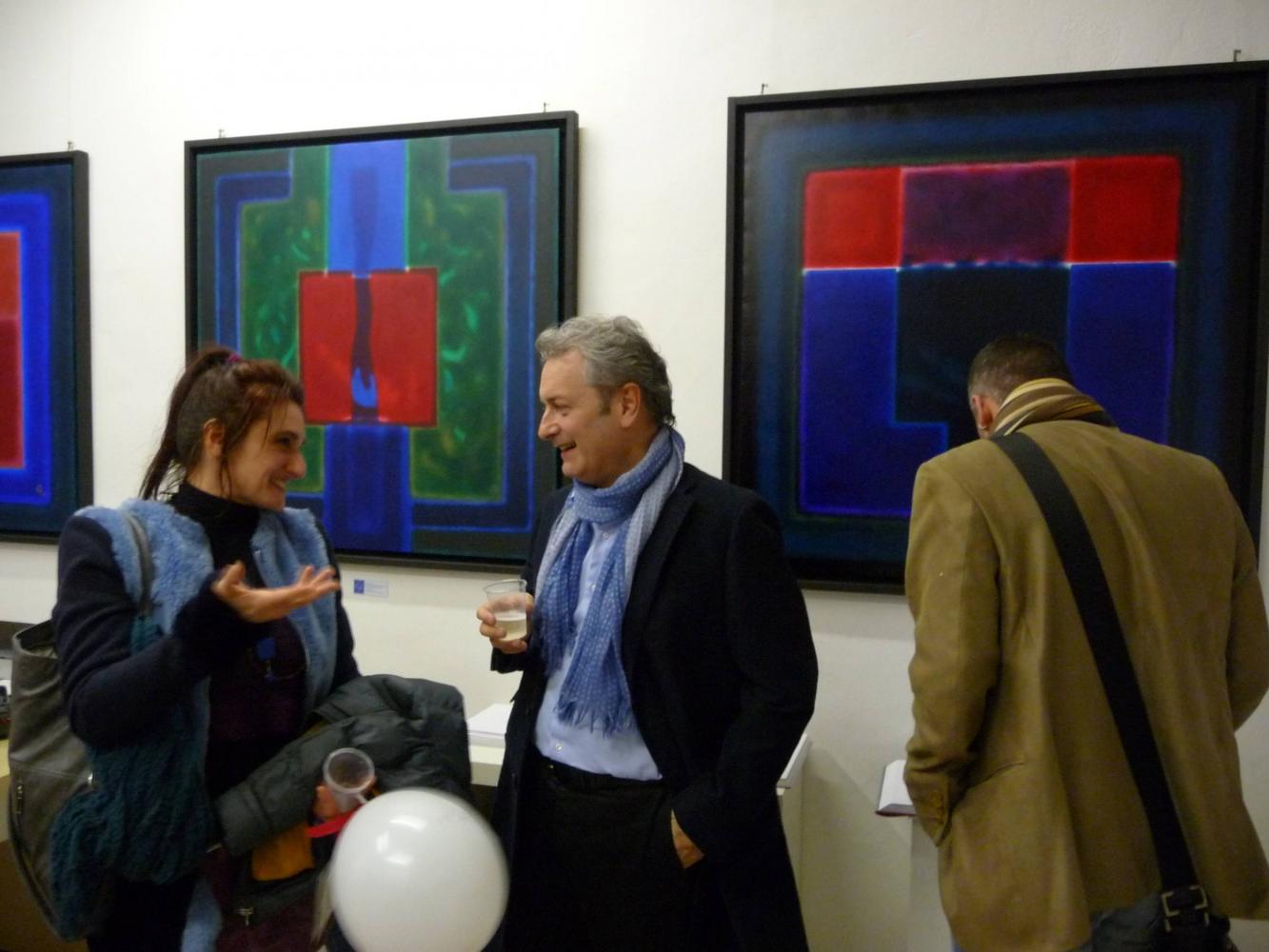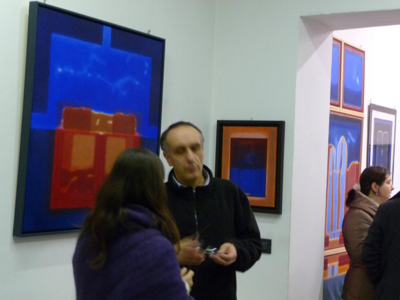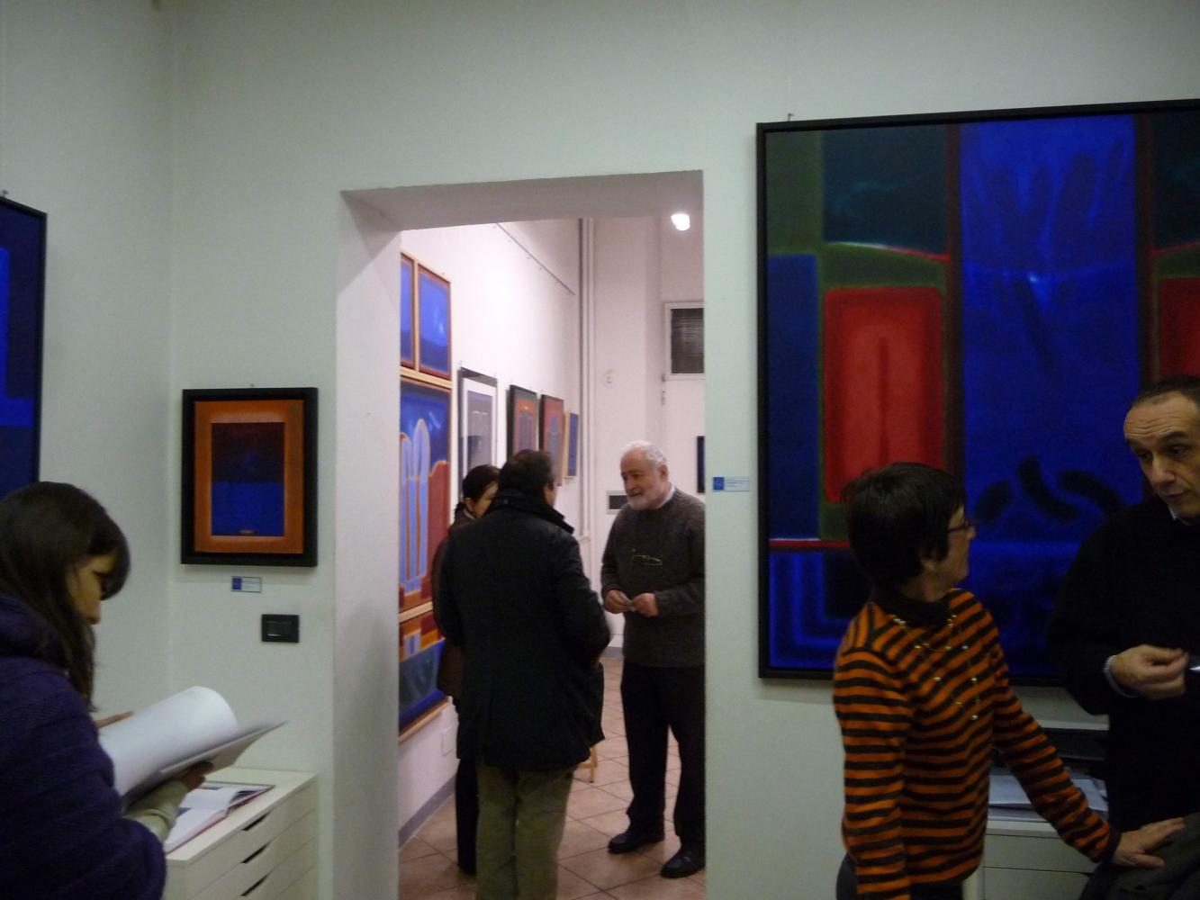 È una mostra in cui si avverte l'intento di dialogo, lontano dalla provocazione ottundente. Si fanno avanti piuttosto ombre e chiarori, silenziose cromie, pause musicali e diafane, riprese di un lavorio pittorico robusto che svolta e comunica in un'estensione vitale. Pare cioè che si crei una tensione avvolgente per chi crea e per chi gli si trova in qualche modo accanto.