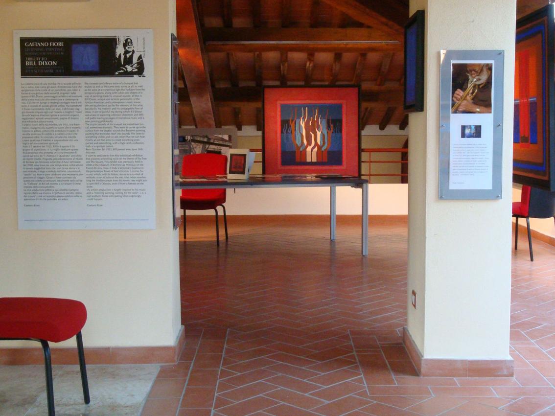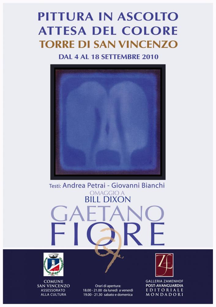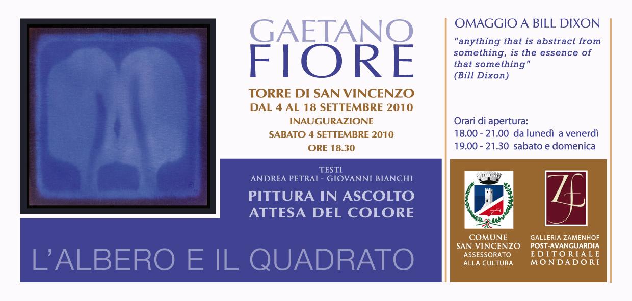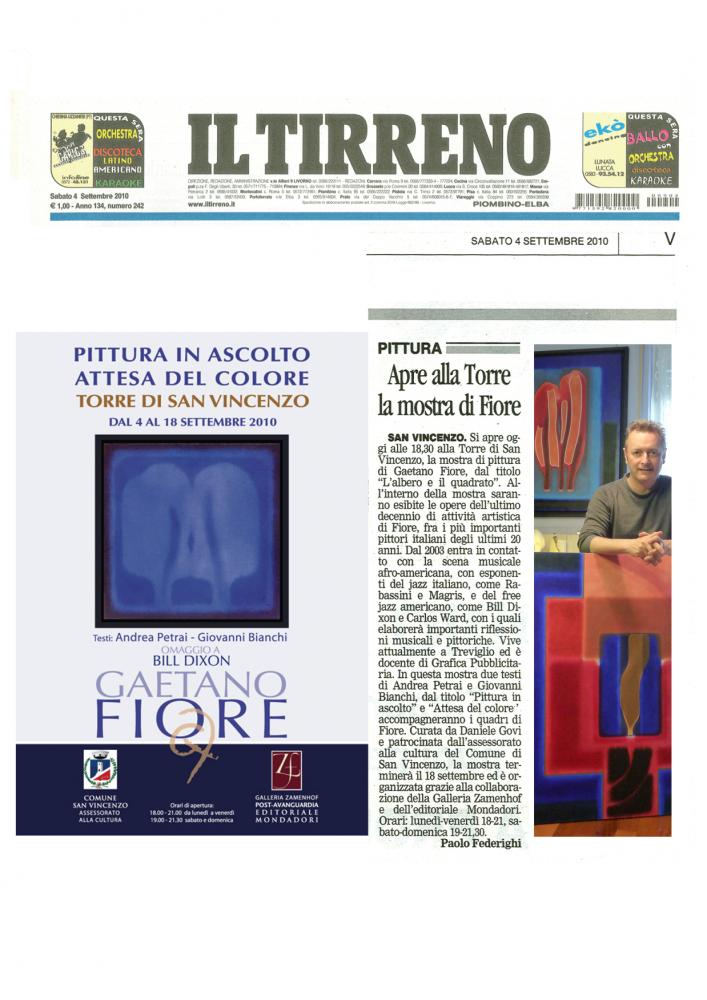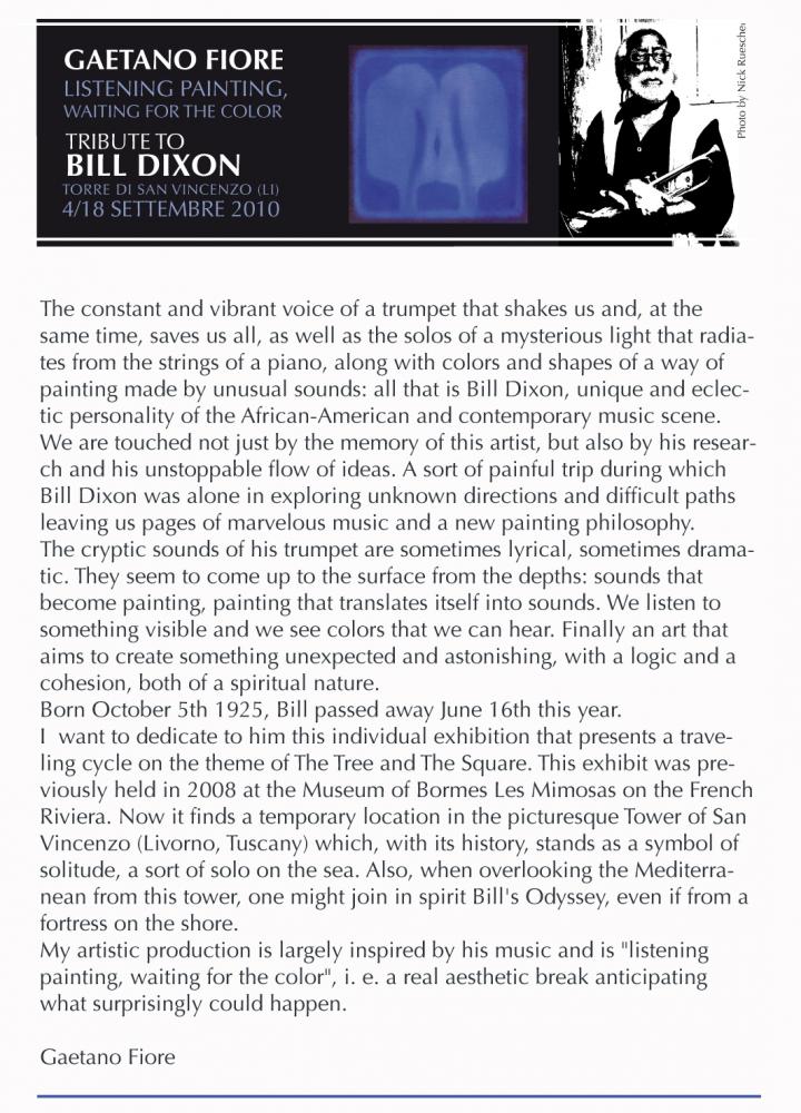 San Vincenzo (LI), 25 agosto 2010. A settembre la Torre di San Vincenzo ospiterà nelle sue belle sale una produzione pittorica dell’artista sul tema “L’Albero e il Quadrato”: 40 opere di grande e piccolo formato realizzate dal 1998 al 2010, riunite sotto il titolo “PITTURA IN ASCOLTO, ATTESA DEL COLORE”. La mostra è dedicata alla scomparsa del grande musicista jazz Bill Dixon.
