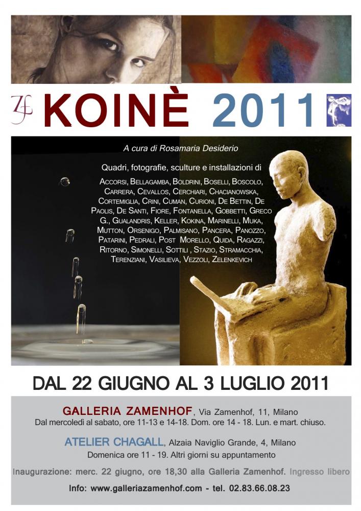 “Koinè” in greco significa “lingua comune”. Tra nuova figurazione e rivisitazione dell’informale, attraverso un ripensamento critico e tecnicamente raffinato, in questa mostra collettiva la curatrice Rosamaria Desiderio seleziona quadri, sculture, fotografie e installazioni di alcuni tra i più significativi artisti contemporanei trattati dalla Galleria Zamenhof: nel tentativo di definire parole e sintassi di un nuovo linguaggio comune dell’arte contemporanea.