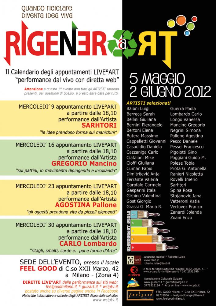 Oltre 40 artisti provenienti da diverse citta italiane ma anche dal 3° Liceo di Belgrado, che utilizzano in parte o totalmente materiale di riciclo per realizzare quadri, sculture, oggettistica e non solo, segnaliamo gli artisti: Giorgio Gost, Mike Ciafaloni, Baioni Luigi, Sarhtori, Guido Poggiani, Massimo Butera, Gregorio Mancino, Fabio Cuman…