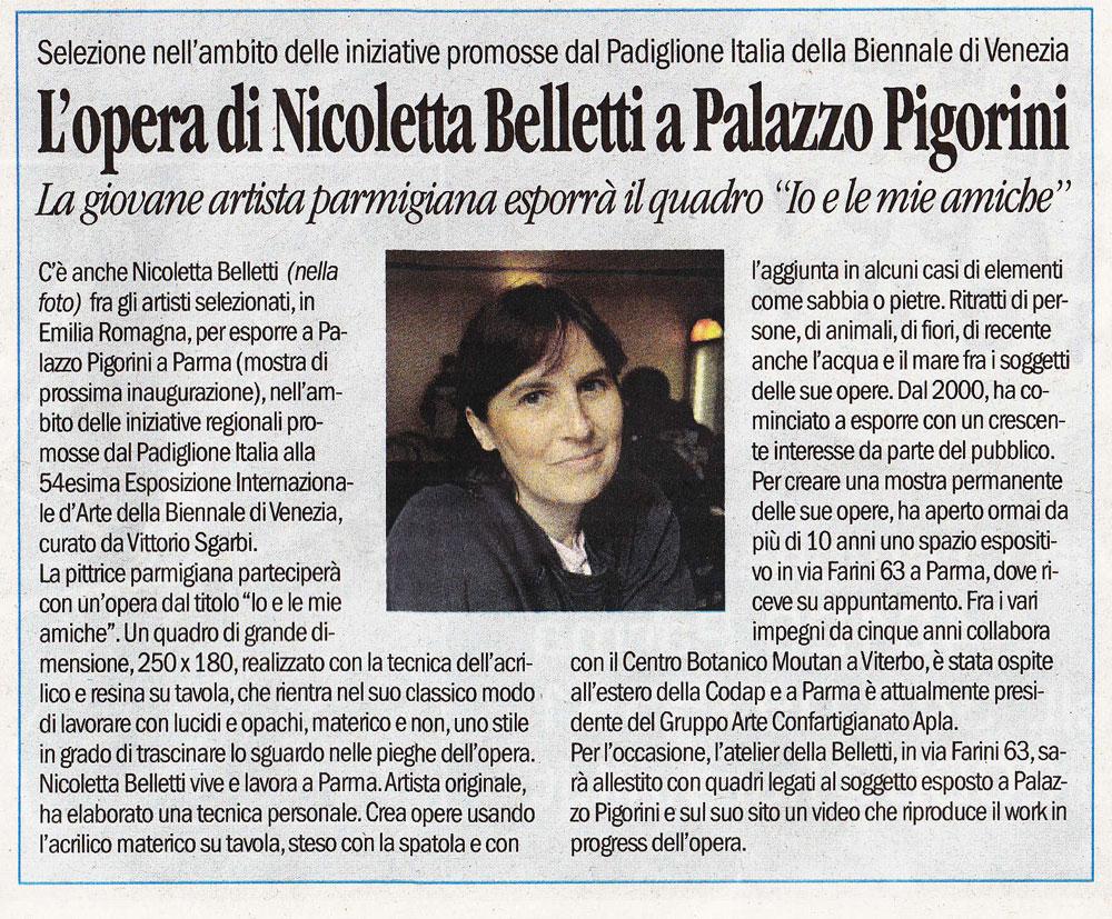 C’è anche Nicoletta Belletti fra gli artisti selezionati per l’esposizione che verrà inaugurata a Parma a Palazzo Pigorini lunedì 18 luglio alle 18.00, nell’ambito delle iniziative regionali promosse dal Padiglione Italia della 54° Biennale d’arte di Venezia, curato da Vittorio Sgarbi.