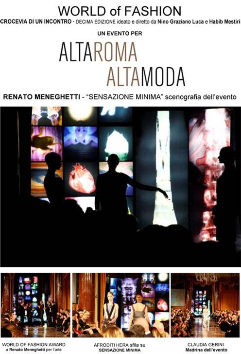 Roma - Oltre 600 persone hanno preso parte il 26 gennaio alla decima edizione del “World of Fashion 2013” al St.Regis Grand di Roma, iniziativa inserita nel calendario ALTAROMA, special guest Claudia Gerini. Grande successo per Afroditi Hera, Azzurra Di Lorenzo, Tatjana Isaj e Massimiliano Giangrossi protagonisti – con le loro ammiratissime collezioni – del dialogo tra culture condotti da un Nino Graziano Luca in grandissima forma.