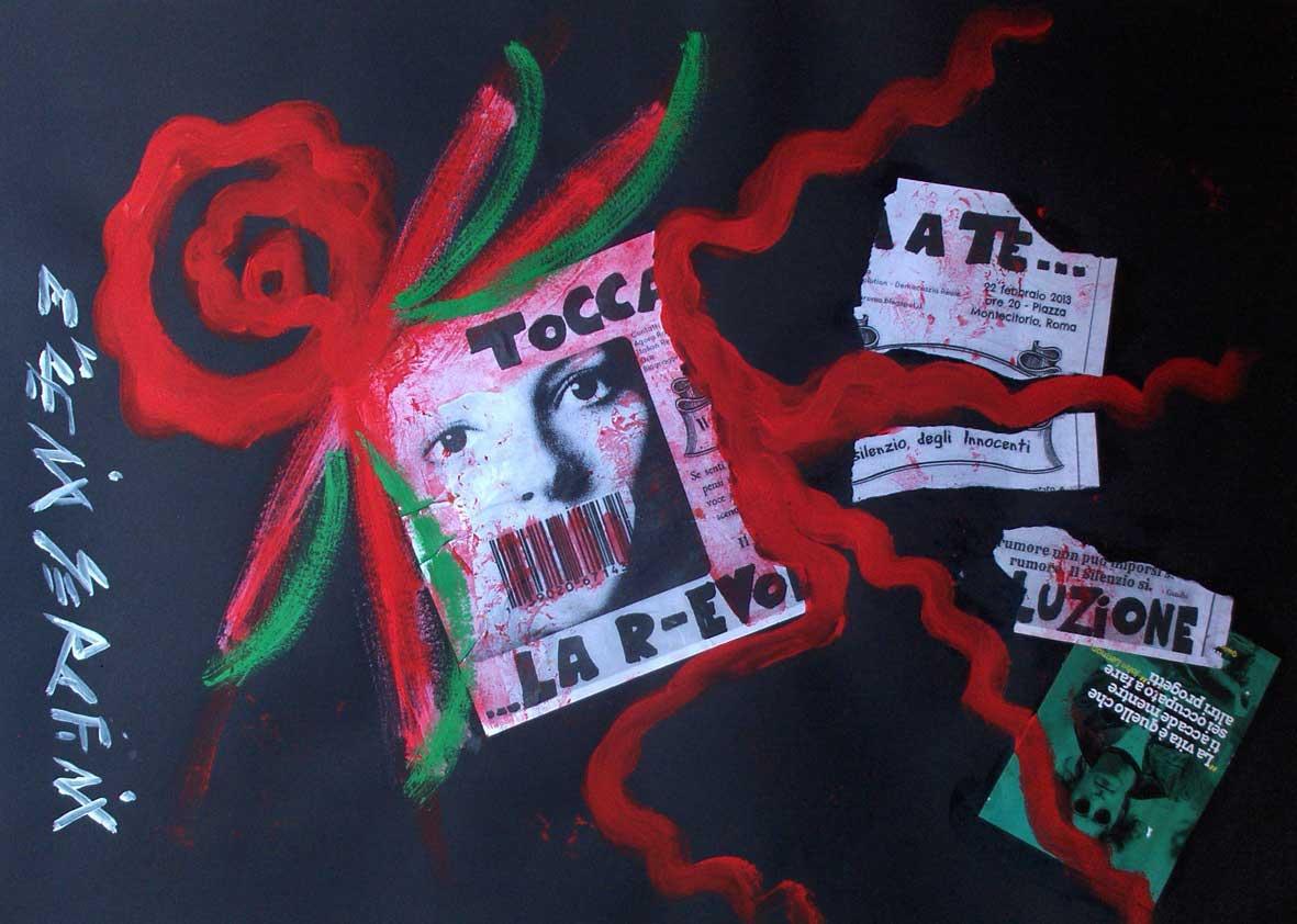 Scrive Carlo Franza nel testo: “E’ per i 700 anni della nascita di Boccaccio, prosatore illustre del Trecento, autore del “Decamerone”, che l’artista Eugenia Serafini, toscana per parte di madre e che è stata docente di Storia dell’Arte dell’Accademia di Belle Arti di Carrara negli Anni ‘90, ha pensato, prendendone spunto e facendone poi omaggio, di sviluppare una serie di capitoli pittorici su una tematica colta e cinematografica, carica di un tempo tutto nostro, che sa di cronaca e di storia, di travestimenti e di lotte, di sesso e libertà, di rivendicazioni e crisi, di politica azzerata e condizione umana. Quaranta lavori su carta che l’artista ha mosso partendo dai temi forti del Decamerone – astuzia, sesso, fortuna, inganno ecc. – e quindi da un tempo lontano, per arrivare a un’arte politica, storica, identitaria, celebrativa, traumatica, simbolica, umana, pur con immagini crude, provocatorie nel loro eccesso, che insistono su fragilità e debolezze, su soprusi e assoggettamenti, su iconografie dove ironia, sberleffo, miseria e teatralità hanno dato modo all’astista romana di sviluppare come pochi un vero e proprio romanzo visivo dei nostri tempi. Un capolavoro unitario in cui le immagini fenomeniche fanno saltare in aria colori, tracce, scritture, collage e mille altre accensioni. E’ così che si sviluppano i due cicli delle opere, il primo tutto mosso da “tracce”, una sorta di operazione di neo-decollage in cui forti pennellate dagli accesi colori assolutizzano gli eventi e la storia contemporanea con una sintesi visiva capace di raccontare in modo forte il vivere quotidiano, l’alienazione urbana, il destino dell’umanità offesa, i tabù sociali, i grandi traumi e i problemi impellenti del ventunesimo secolo; il secondo che potremmo chiamare “Romance” prende il suo incipit dallo STRAPPO di un bel volto di donna africana e sviluppa una ventina di opere sulla tematica del SOGNO, il SOGNO del migrante (“arrivano aggrappati al FERRO delle NAVI”, “Pescatori di sOgni”, “VIA! con TE!”), un memento mori di dolore, di criticità, di forte meditazione dove multiculturalismo e arte tengono corpo di dati e contorni reali. Ecco allora come ancora una volta Eugenia Serafini, illustre artista dei nostri tempi, con tecniche personalissime e sempre nuove, affina ricerche e sorregge narrazioni, un nuovo Decamerone, crocivia di mille storie e umanità.”