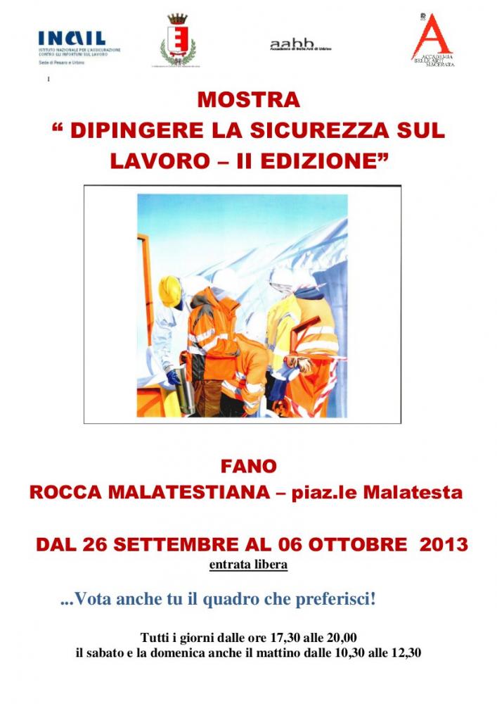 Concorsi, Urbino, Fano, 26 September 2013 III° Mostra collettiva dei finalisti Premio Pittura INAIL -Dipingere la sicurezza sul lavoro- dal 26/09 al 6/10/2013 Rocca Malatestiana, Fano Inserito 12 anni fa 1 Mi piace Non piace più 3 Commenti 85 Visite Condividi Facebook Twitter Google + Commenti 2 12 anni fa Cat Fotografo Compliments ! 12 anni fa emilia rebuglio Artista Congratulazioni! Inserisci commento E' necessario effettuare il login o iscriversi per inserire il commento Login