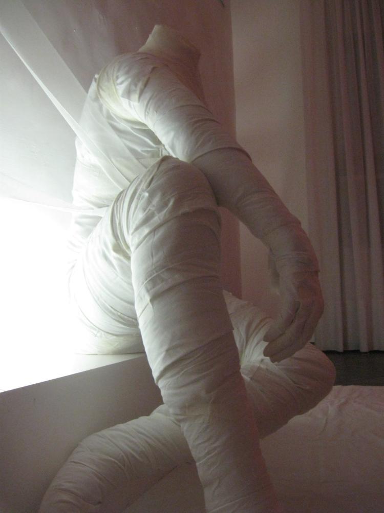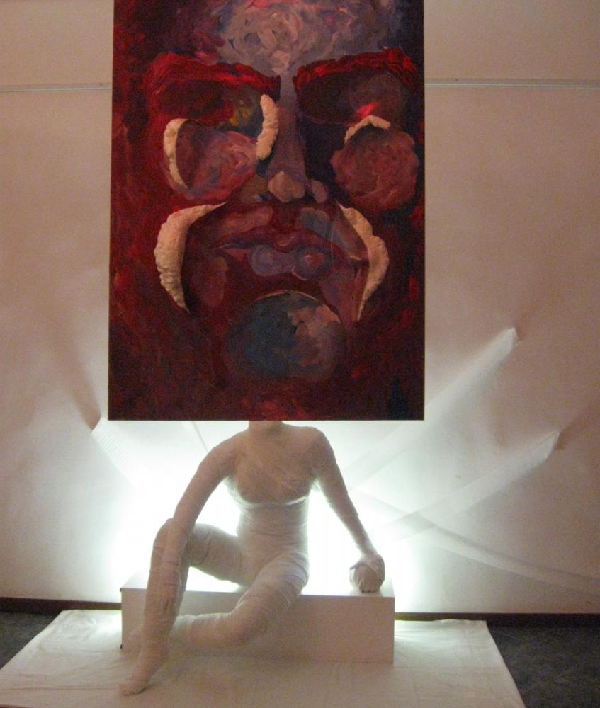 Corpi dalle forme generose e rassicuranti dei dipinti, ignari delle mode e dei dettami sociali del mondo patinato, si fronteggiano con esseri acefali, ombre scomposte e sconnesse, immagini riflesse e deformate dei volti sfigurati dell’ installazione.