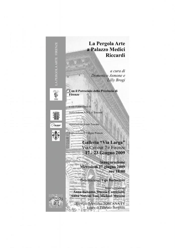 Cristina Anna Adani partecipa all'esposizione "La Pergola Arte a Palazzo Medici Riccardi" presso la Galleria "Via Larga", in via Cavour 7/r, Firenze, dal 17 al 23 Giugno 2009, inaugurazione Mercoledì 17 Giugno ore 18:00