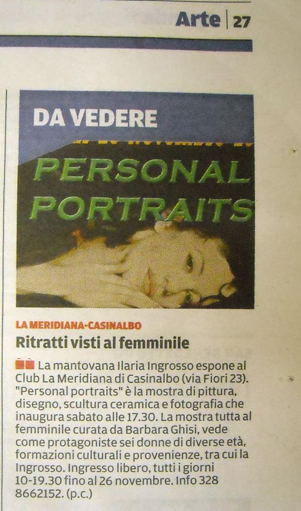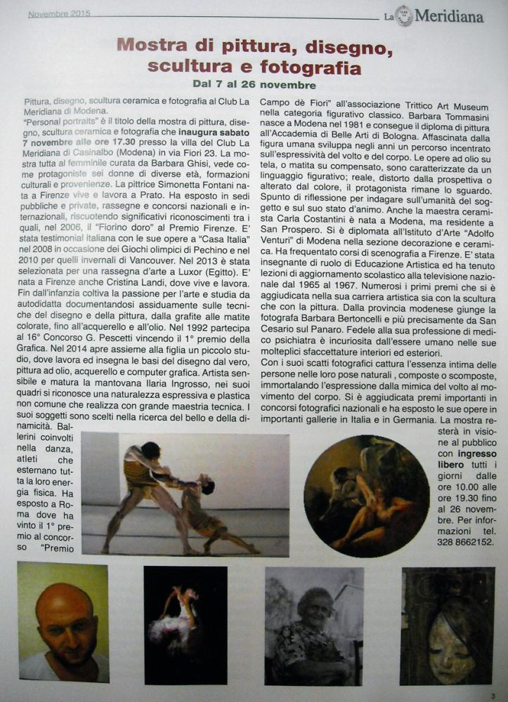 "Personal portraits" è il titolo della mostra di pittura, disegno, scultura ceramica e fotografia che inaugura sabato 7 novembre alle ore 17.30 presso la villa del Club La Meridiana di Casinalbo (Modena) in via Fiori 23. La mostra tutta al femminile curata da Barbara Ghisi, vede come protagoniste sei donne di diverse età, formazioni culturali e provenienze. La pittrice Simonetta Fontani nata a Firenze vive e lavora a Prato. Ha esposto in sedi pubbliche e private, rassegne e concorsi nazionali e internazionali, riscuotendo significativi riconoscimenti tra i quali, nel 2006, il "Fiorino doro" al Premio Firenze. E' stata testimonial italiana con le sue opere a "Casa Italia" nel 2008 in occasione dei Giochi olimpici di Pechino e nel 2010 per quelli invernali di Vancouver. Nel 2013 è stata selezionata per una rassegna d'arte a Luxor (Egitto). E' nata a Firenze anche Cristina Landi, dove vive e lavora. Fin dall’infanzia coltiva la passione per l'arte e studia da autodidatta documentandosi assiduamente sulle tecniche del disegno e della pittura, dalla grafite alle matite colorate, fino all’acquerello e all’olio. Nel 1992 partecipa al 16° Concorso G. Pescetti vincendo il 1° premio della Grafica. Nel 2014 apre assieme alla figlia un piccolo studio, dove lavora ed insegna le basi del disegno dal vero, pittura ad olio, acquerello e computer grafica. Artista sensibile e matura la mantovana Ilaria Ingrosso, nei suoi quadri si riconosce una naturalezza espressiva e plastica non comune che realizza con grande maestria tecnica. I suoi soggetti sono scelti nella ricerca del bello e della dinamicità. Ballerini coinvolti nella danza, atleti che esternano tutta la loro energia fisica. Ha esposto a Roma dove ha vinto il 1° premio al concorso "Premio Campo dè Fiori" all'associazione Trittico Art Museum nella categoria figurativo classico. Barbara Tommasini nasce a Modena nel 1981 e consegue il diploma di pittura all'Accademia di Belle Arti di Bologna. Affascinata dalla figura umana sviluppa negli anni un percorso incentrato sull'espressività del volto e del corpo. Le opere ad olio su tela, o matita su compensato, sono caratterizzate da un linguaggio figurativo; reale, distorto dalla prospettiva o alterato dal colore, il protagonista rimane lo sguardo. Spunto di riflessione per indagare sull'umanità del soggetto e sul suo stato d'animo. Anche la maestra ceramista Carla Costantini è nata a Modena, ma residente a San Prospero. Si è diplomata all'Istituto d’Arte “Adolfo Venturi” di Modena nella sezione decorazione e ceramica. Ha frequentato corsi di scenografia a Firenze. E' stata insegnante di ruolo di Educazione Artistica ed ha tenuto lezioni di aggiornamento scolastico alla televisione nazionale dal 1965 al 1967. Numerosi i primi premi che si è aggiudicata nella sua carriera artistica sia con la scultura che con la pittura. Dalla provincia modenese giunge la fotografa Barbara Bertoncelli e più precisamente da San Cesario sul Panaro. Fedele alla sua professione di medico psichiatra è incuriosita dall'essere umano nelle sue molteplici sfaccettature interiori ed esteriori. Con i suoi scatti fotografici cattura l'essenza intima delle persone nelle loro pose naturali , composte o scomposte, immortalando l'espressione dalla mimica del volto al movimento del corpo. Si è aggiudicata premi importanti in concorsi fotografici nazionali e ha esposto le sue opere in importanti gallerie in Italia e in Germania. La mostra resterà in visione al pubblico con ingresso libero tutti i giorni dalle ore 10.00 alle ore 19.30 (SUONARE campanello settore sportivo) fino al 26 novembre. Per informazioni tel. 328 8662152.
