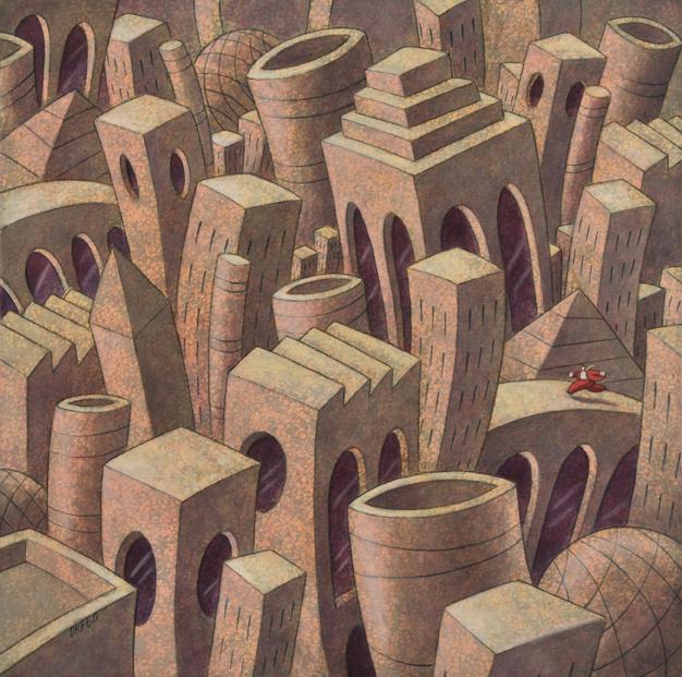 Orfeo continua il suo onirico reportage sulle contraddizioni della vita e dell’uomo, i suoi miti e le sue problematiche, le sue debolezze e le sue, sempre più “artificiali” certezze. Con la pittura, fortemente legata alla contemporaneità, l’artista coglie l’ironia insita nelle situazioni con visioni apocalittiche e irreali dove l’unica via di scampo è la Patafisica, la scienza delle soluzioni immaginarie.