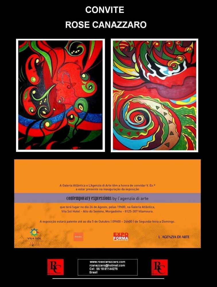 No próximo dia 26 de Agosto de 2010, pelas 19h00, a Galeria Atlântica inaugura uma exposição internacional de arte e terá duas obras da artista brasileira ROSE CANAZZARO, conhecida em todo o mundo. CONTEMPORARY EXPRESSIONS BY L’AGENZIA DI ARTE – Terá a participação dos Artistas Plásticos Adem Rusinovci, António Dulcídio, Carla Taveira, Célia Alves, Claudio Bandini, Cosme, Cristina Mendonça, Despina Papadopoulou, Edmar Sales, Elisabete Silva, Ernesto Silva, Francisco Urbano, Gaia, Gilmara Oliveira, Graciela Otero, Isabel Alfarrobinha, José Cunha, Lucia Sandroni, Mafalda D’Eça, Majlinda Kelmendi, Massimo Bardi, Mirella Orlandini, Nela Vicente, Nicolau Campos, Paolo Facchinetti, Patty Silva, Paulo Themudo, Pedro Charters D’Azevedo, Robert Schwarz, Roberto Samar, Rosa Lapinha, Rose Canazzaro, Ruela, Santiago Ribeiro, Sara Tillo, Teresa Duarte, Thommy Ha, Victor Tajes e Vifer.