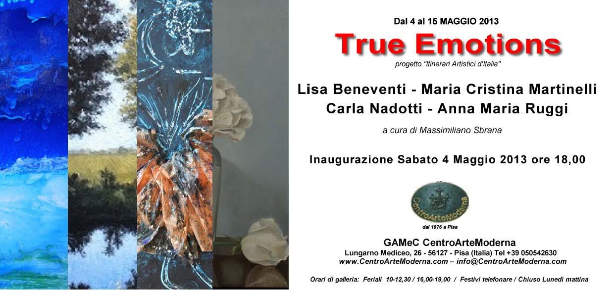 Si inaugura Sabato 4 maggio alle ore 18,00 presso il GAMeC CentroArteModerna di Pisa (sul Lungarno Mediceo al numero 26) la mostra "TRUE EMOTIONS", curata e ordinata da Massimiliano Sbrana, che ospiterà per la prima volta a Pisa, nell'ambito del progetto "Itinerari Artistici d'Italia", le opere di 4 artisti emiliane ossia LISA BENEVENTI, MARIA CRISTINA MARTINELLI, CARLA NADOTTI, ANNA MARIA RUGGI.