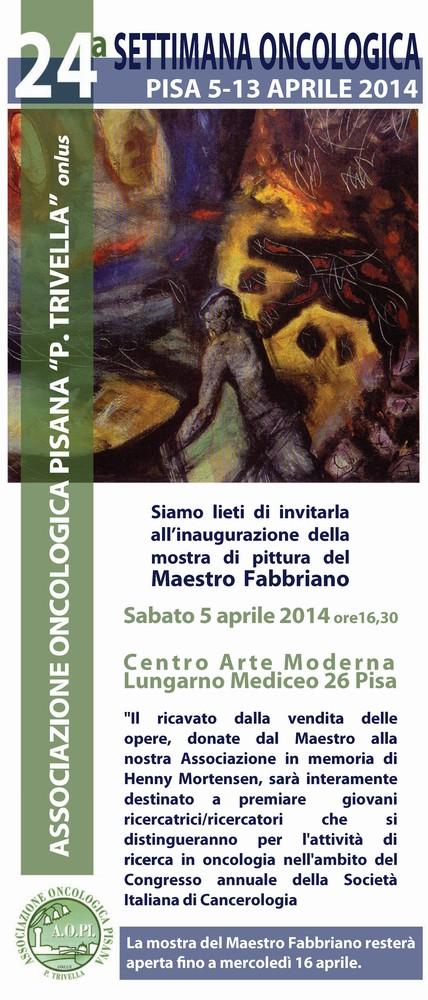 Si inaugurerà Sabato 5 Aprile 2014 alle ore 16,30 (visitabile fino al 16 Aprile con ingresso libero) a cura Massimiliano Sbrana, presso la GAMeC CentroArteModerna di Pisa (Lungarno Mediceo,26) la mostra "La Donazione Henny Mortensen - Opere di Fabbriano" , promossa dall’Associazione Oncologica Pisana (Aopi) “Piero Trivella nell'ambito della “Settimana Oncologica” 24ª edizione, il cui intero ricavato sarà destinato a premiare giovani ricercatrici e ricercatori in oncologia.