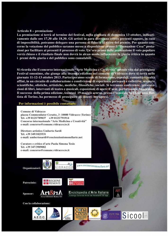 2^ fase: gli artisti selezionati riceveranno conferma via mail entro il 25 settembre 2013, ed il loro elenco sarà reso pubblico sul sito comunale; qualora qualcuno di essi non dovesse confermare la sua partecipazione ne saranno scelti altri tra le eventuali riserve. Questi dovranno effettuare un versamento di 30 euro a contributo parziale delle spese e potranno così accedere alle fasi successive del concorso (tali importi andranno a costituire parte del monte premi finale e saranno utilizzati per la comunicazione). Sarà inoltre stampato un catalogo in cui sarà dedicata una pagina ad ognuno degli artisti selezionati e dove oltre all’immagine dell’opera in concorso saranno fornite eventuali note critiche o di curriculum dell’artista. La ricevuta del bonifico (effettuato tramite Iban che sarà fornito all’atto della conferma di selezione) dovrà riportare come causale “partecipazione al 1°concorso internazionale “Arte Medicina Creatività”). La ricevuta dovrà essere allegata alla scheda di iscrizione che costituirà l’accettazione di tutti gli articoli del bando, ed andrà inviata entro e non oltre il 30 settembre 2013 pena l’esclusione dal concorso.