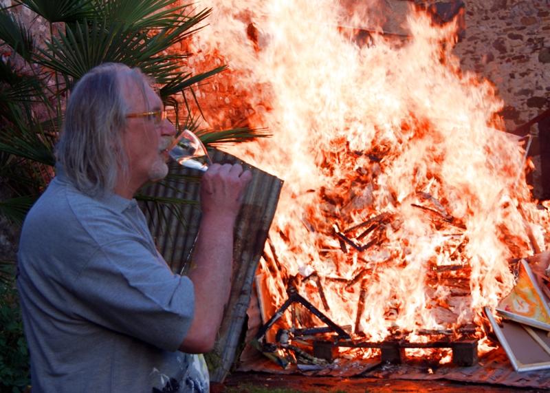 L’accensione del grande falò composto da 147 opere, l’audacia di ridurre in cenere le tele dipinte in un momento della vita che poi si vuole cancellare dalla memoria, le fiamme che si levano alte nel cielo accompagnate dal canto del mezzosoprano Isabella Comand…..