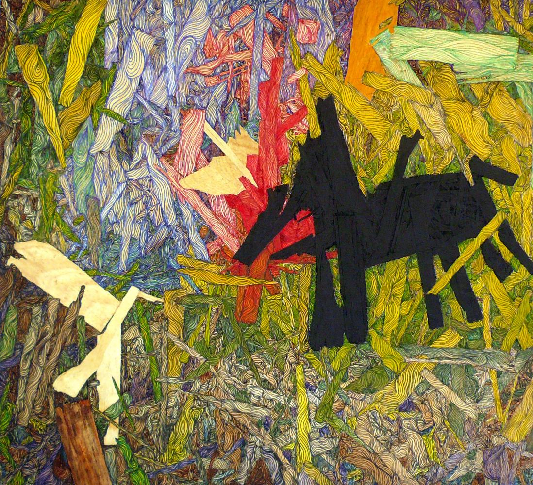 OSB, Oriented Strand Board è il materiale spurio eppure costitutivo dei suoi ultimi lavori, avanzi di legno grezzo detti strand, il cui assemblaggio determina percorsi, sagome e motivi formali che l’artista può scegliere se assecondare, accentuandone l’orientamento con un accelerazione cromatica o ignorare, lasciando prevalere la natura scarna e originaria. L’alternanza dell’intervento generativo dell’artista o la sua astensione, unita al tessuto originario del materiale, disegna trame di grande impatto estetico; la materia condiziona l’artista e l’orienta, allo stesso modo in cui l’artista imprime un flusso, un indirizzo, con la sua inappuntabile gestualità.