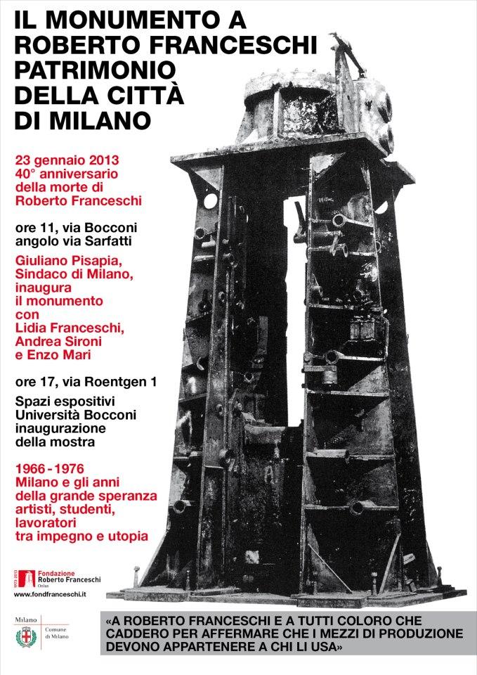 In occasione del 40° anniversario della morte di Roberto la Fondazione Roberto Franceschi Onlus, in collaborazione con l’Università Bocconi e col patrocinio del Comune di Milano, organizza una mostra che sarà inaugurata il 23 gennaio e durerà fino al 10 aprile. Il percorso espositivo sarà articolato in sezioni dedicate alle principali aree di ricerca di quegli anni e si svolgerà in una serie di spazi espositivi di via Roentgen 1, sia al chiuso sia all’aperto, coinvolgendo l’intero tessuto dell’Università. L’Università Bocconi è il luogo ideale per la mostra, non solo per la presenza del monumento, ma soprattutto perché luogo d’incontro fra economia, cultura e lavoro.