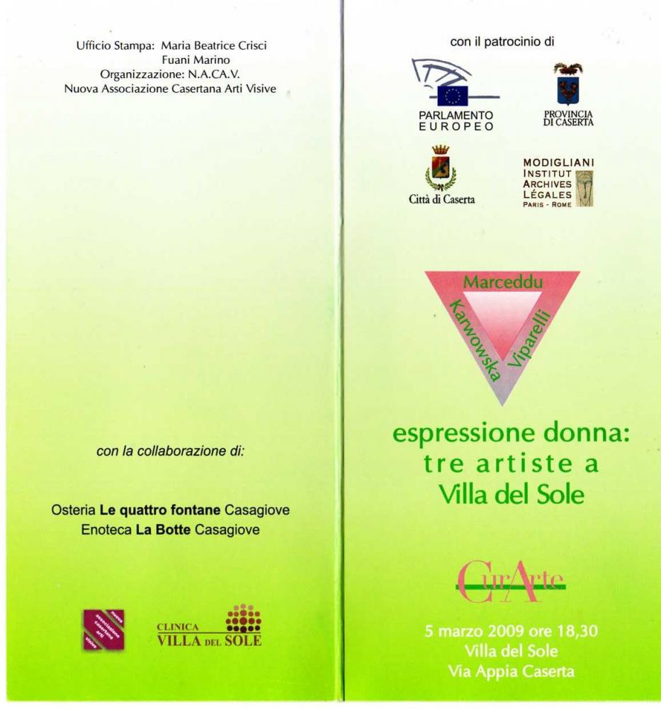 A pochi metri dalla Reggia di Caserta, la struttura sanitaria diretta da Renato Esposito e presieduta da Gianluca Maccauro ospita una mostra declinata al femminile che vedrà disseminate nei quattro piani della Clinica oltre sessanta opere delle tre artiste Carla Viparelli, Anna Marceddu e Barbara Karwowska. Villa del Sole, “clinica-museo” per la sesta volta scenario del ciclo espositivo “CurArte”, ideato dai critici Enzo Battarra, Angelo De Falco, Luigi Fusco in collaborazione con la galleria Studio Oggetto e l’associazione Nacav presieduta da Pasquale De Simone, offre quindi a pazienti e pubblico un’alternativa alla tradizionale frequentazione della casa di cura. L’esposizione, patrocinata dal Comune e dalla Provincia di Caserta di concerto con il Parlamento Europeo, vedrà come cornice gli ambienti del pianterreno, dedicati alla hall e all’accettazione, e le sale del terzo piano.