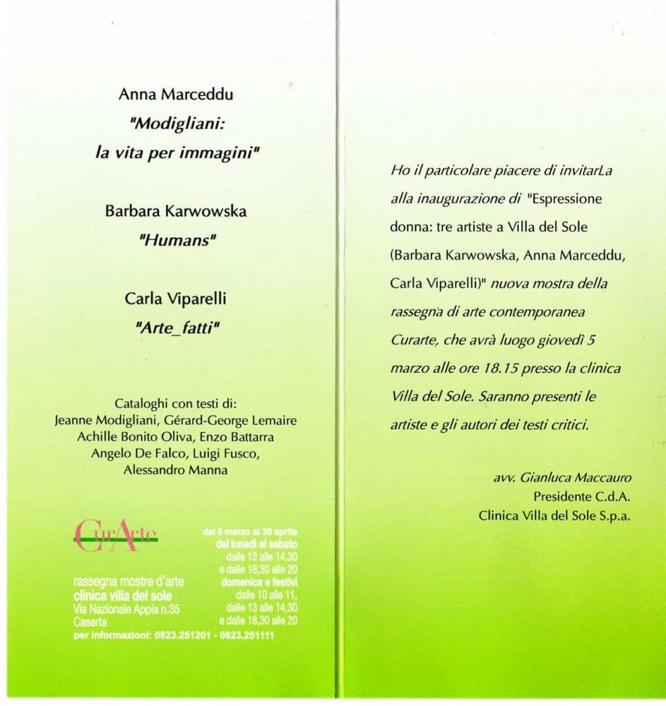 Carla Viparelli e Barbara Karwowska - l’una partenopea, l’altra originaria di Danzica ma di stanza a Napoli da oltre quindici anni - si cimentano, ciascuna secondo la propria cifra, con il mezzo pittorico; la ricerca estetica della fotografa sarda Anna Marceddu è rintracciabile nei numerosi scatti presentati a Villa Del Sole. Quest’ultima, come si evince dal titolo della mostra Modigliani: la vita per immagini, realizza grazie al Modigliani Institut Archives Légales di Roma e Parigi delle “foto-scritture” sulle tracce dell’artista e dei luoghi che caratterizzarono il suo percorso. Nella pittura figurativa di Barbara Karwowska, invece, sfila su sfondi monocromi un variegato “campionario di figure umane” racchiuso nell’esposizione intitolata Human. Carla Viparelli, dal canto suo, presenta nella mostra battezzata Arte_fatti tele dai nomi evocativi in cui, secondo gli schemi di un “concettualismo mediterraneo e surreale”, tutto sembra possibile.