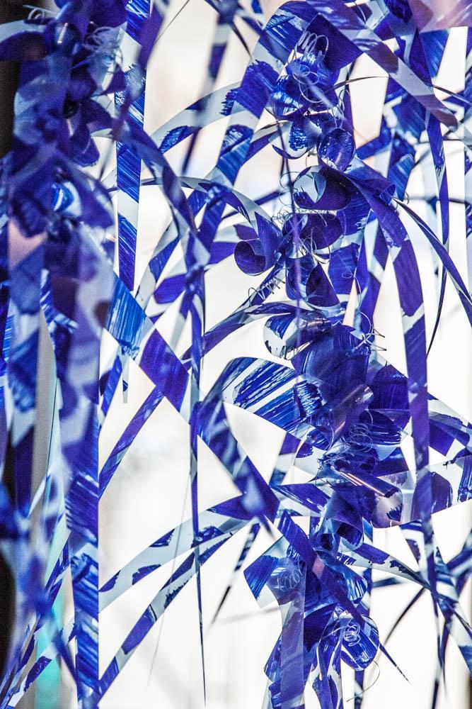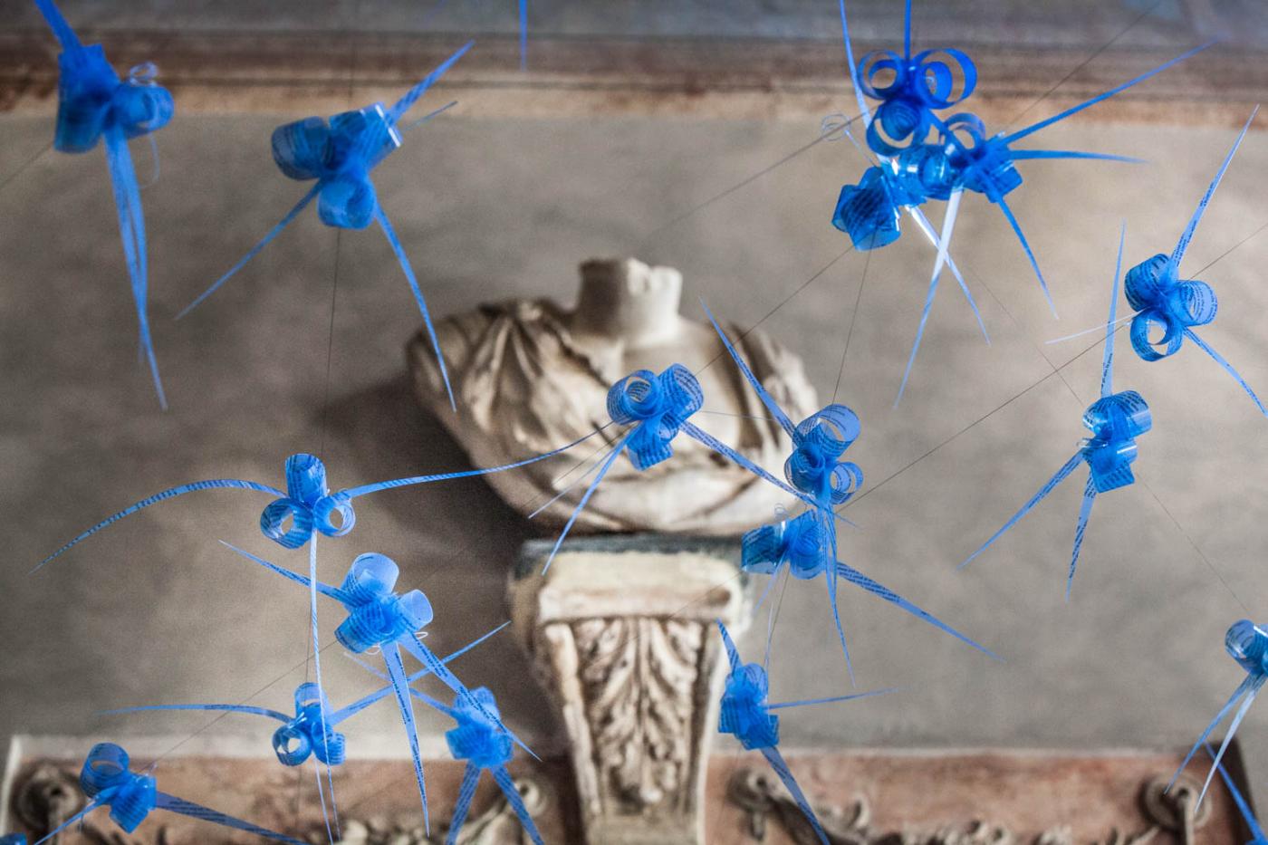 Io sono quel che sono intitola una mostra che sottoscrive, su un versante, una messa in crisi della stabilità delle certezze, siano esse etiche, estetiche, identitarie, percettive, fenomenologiche, scientifiche, confessionali, filosofiche, e sull’altro versante sottoscrive un atto di fede, paradossale, nell’impermanenza delle cose e nell’indeterminatezza delle realtà. L’affermazione apodittica Io sono quel che sono detiene una potenzialità tautologica per cui potrebbe essere ribaltata nell’enunciato Io non sono quel che non sono, senza perdere né accrescere il suo portato di senso. Ecco da dove scaturisce la fluidità della sua Pittura fluttuante che scorre, corre fuori dal quadro, dalla cornice, per farsi cespuglio di filamenti vibratili, viluppo di steli e di pensieri che si imprimono sulla verginità di pellicole radiografiche trasparenti, di colorazioni a dominante azzurra, per corpi frammentati, per organi della mente, della poesia, dell’immaginario. Il ciclo di questi grovigli esplosivi e cangianti si dissemina sulle pareti o si assembla in cerchio nello spazio, per immergere lo spettatore in un paesaggio reale e metaforico insieme che, per un effetto cinematografico, voluto dall’artista tramite la sovra-proiezione di un video, riporta chi guarda subito nello scenario vibrante della Natura, Nella Sala degli affreschi di Bernardo Castello entra magicamente la prima edizione illustrata, stampata a Genova nel 1590, del poema eroico di Torquato Tasso La Gerusalemme Liberata. Con gesto poetico-letterario, Margherita Levo Rosenberg esprime il suo omaggio, a testo e contesto, ideando un’installazione aerea, site-specific, intitolata Pensieri migranti, esposta nel salone come un volo alto di rondini. Si tratta di frammenti del Poema tassiano stampati su pellicole radiografiche celesti, colore rinviante alla bandiera d’Israele, da riavvolgere manualmente su se stessi.