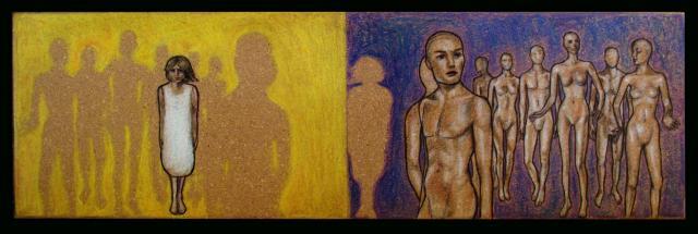 L’immagine del malato è visibile sul lato sinistro (per mezzo di una sagoma) e separata dal resto della composizione: il modo più semplice e condiviso di sostenerlo è quello di ignorarlo, di fingere che non esista, sottraendo la questione a se stessi. Il riquadro di sinistra designa una persona mentalmente instabile figurata al centro e in maniera più realistica, proprio perché essa manifesta inevitabilmente quello che è, non mostrando sovrastrutture alla propria immagine esterna ed interna. Le sagome attorno (speculari a quelle dell’altra porzione) contestano la sua collocazione possibile nella società (“esisto, anche se gli altri vivono del contrario”) e rivelano – attingendo al modello bio-psico-sociale – il condizionamento e l’incidenza che questa può produrre nel soggetto. Il colore giallo indica la stato di follia, ma è spesso associato al senso d’identità, all’Io. Il viola, suo complementare (complementarità, compresenza di opposti son elementi della mia cifra stilistica), è frequentemente riconducibile ad espressioni di forma negativa.