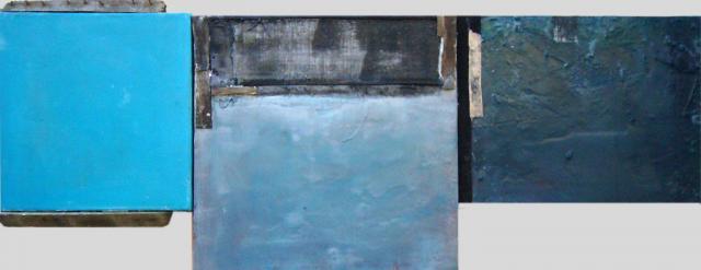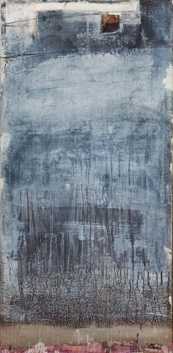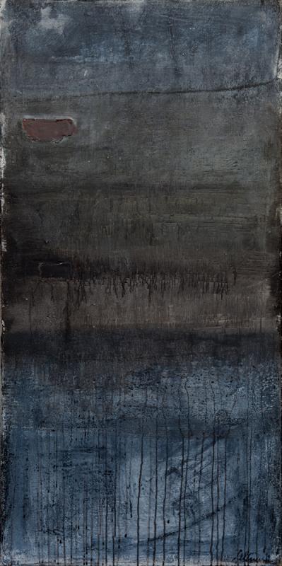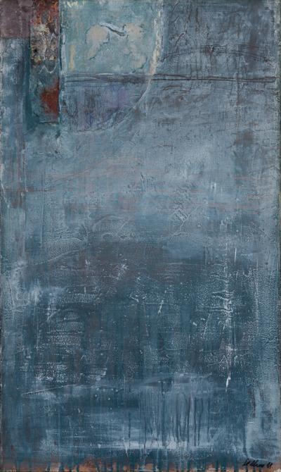 Usa tempere, acrilici, collages, impasta a mano la sabbia, il gesso e il colore e questa fisicità della materia si suddivide in grumi o filamenti e lacerazioni che creano un contrasto lucido-opaco oppure ruvido-liscio.