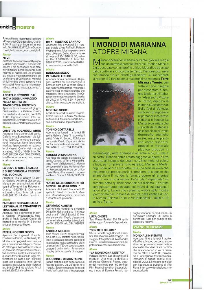 ARTICOLO SCRITTO DAL CRITICO D'ARTE RENZO FRANCESCOTTI PER IL MENSILE TRENTINO MESE (APRILE 2013) RIGUARDANTE LA MOSTRA PERSONALE DI MARIANNA MERLER CHE INAUGURERA' SABATO 6 APRILE NELLA SPLENDIDA TORRE MIRANA A TRENTO.