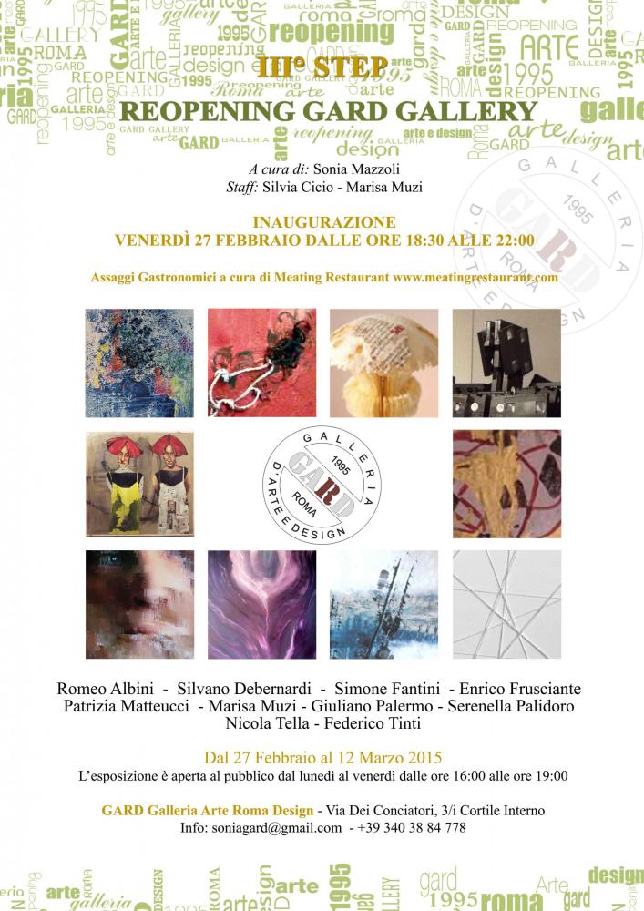 Terzo appuntamento del ciclo espositivo denominato "Reopening Gard Gallery " ideato da Sonia Mazzoli Direttore Artistico della Galleria Gard, come progetto artistico dedicato alla riapertura degli spazi espositivi, sede della Galleria Gard. Chiusi dal 20 ottobre 2011 perché coinvolti nell’alluvione di Roma. L’idea è di dedicare parte delle esposizioni del primo anno di riapertura a tutti quegli artisti che nel tempo hanno collaborato con Sonia Mazzoli o con la Galleria Gard. In ogni edizione, sarà presentata una rigorosa selezione fatta tra le opere più interessanti del percorso artistico dei diversi autori, in tutto saranno cinque gli appuntamenti espositivi. Nella prima e nella seconda edizione sono state presentate opere selezionate realizzate da trentuno artisti, in questa terza edizione, gli artisti selezionati sono dieci: Romeo Albini, Silvano Debernardi , Simone Fantini, Enrico Frusciante, Patrizia Matteucci, Marisa Muzi, Giuliano Palermo, Serenella Polidoro, Nicola Tella, Federico Tinti, diversi per stili e linguaggi artistici, ma uniti dalla passione per l’arte e la voglia di sperimentare mettendosi in gioco.