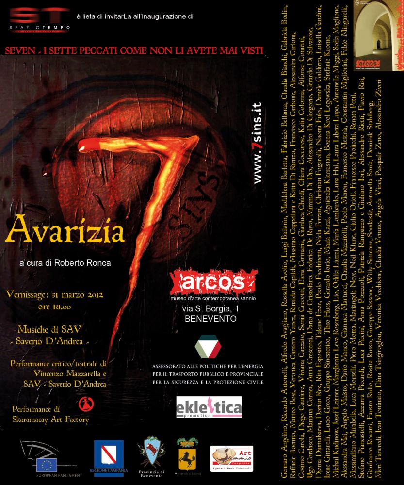 Dopo il grande successo di GOLA, INVIDIA, ACCIDIA e SUPERBIA arriva il quinto appuntamento di SEVEN con AVARIZIA, in una location perfetta quanto prestigiosa: il museo ARCOS di Benevento, con i suoi magnifici interni e la sua posizione strategica al centro della città. 7 è un grande evento che vuole attirare l'attenzione dell'artista e dello spettatore sulla complessità di interpretare con immagini attuali, al di fuori della iconografia classica, un pensiero antico. I 7 peccati capitali possono essere uno stimolo verso l'interpretazione libera. E anzi è proprio nell'attualità della visione di artisti contemporanei che si può trovare la vera essenza del peccato, oggi. Seven è una mostra che affronta ognuno dei 7 peccati, uno per volta. Ogni peccato viene sviscerato, osservato, fissato, ricordato. Gli artisti creano 1 opera per ognuno dei 7 argomenti. 7 eventi, quindi (+ 1), che nel loro essere parte, creano il tutto.