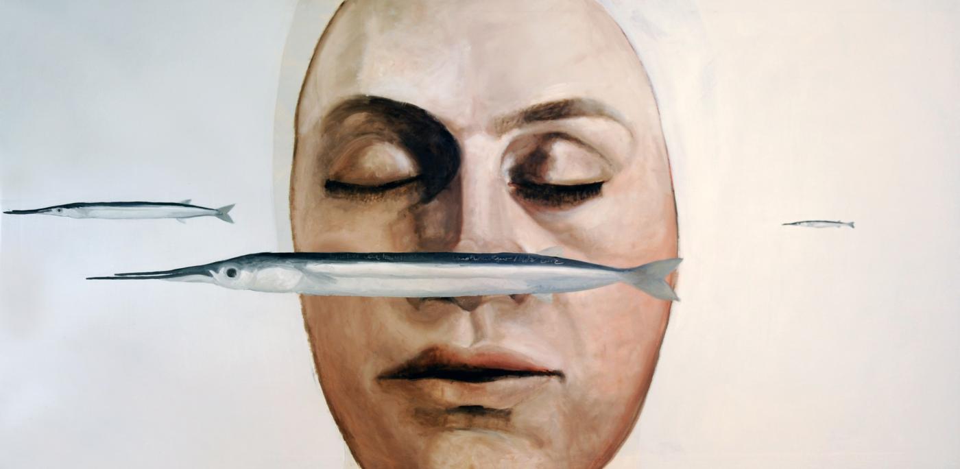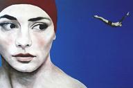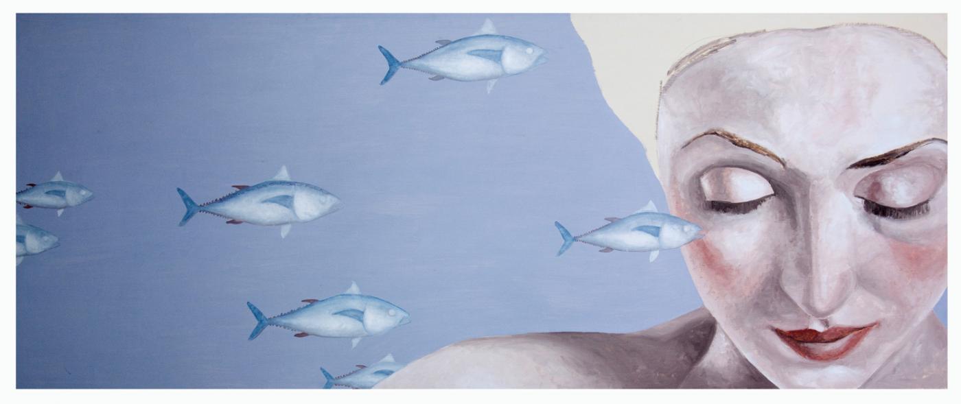R32;The dream leads them to the sea, the realm of freedom and infinity, whose voice they are attracted to, the voice they heard in the shell they raised to their ear. They are wearing their swimming caps and are ready to dive (Portrait with diver) or they have already dived (Diver), while fishes lightly brush up against them, tiny fishes or huge fishes like tuna, (Dreamer with tuna, Woman with Pleiades). They dream these fishes arranged in the constellation of Pleiades, coming back from the depths of the infinite ocean to the celestial infinity on high. These symbols are redeemed, all positive, from the water, to the fish, to the shell.