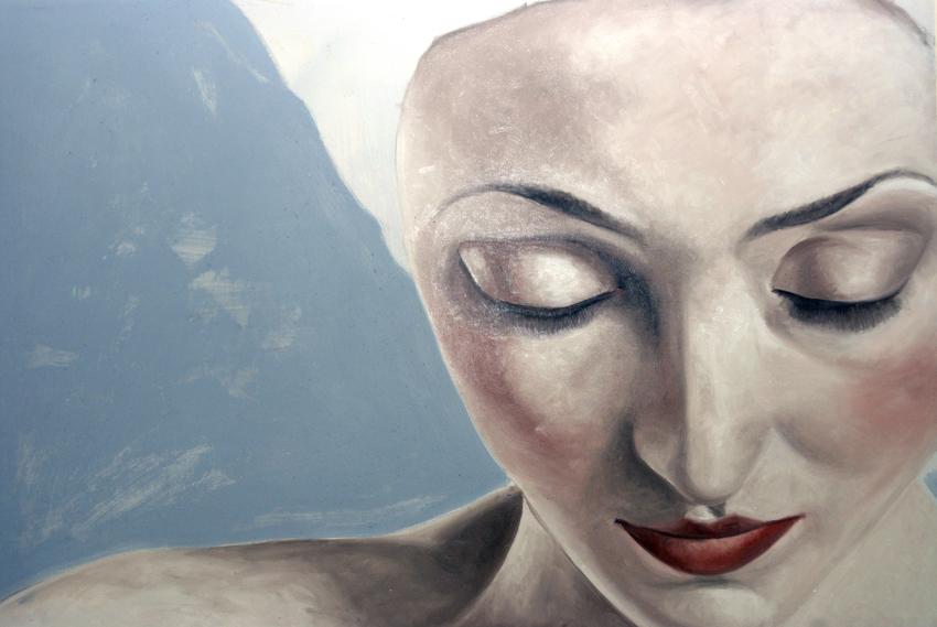 I suoi volti sembrano manipolati dalla mano anziché dal pennello, come fossero di terracotta, di marmo, vere sculture dipinte. E non sono volti disumanizzati: sia che siano alla lontana espressionisti sia che siano più realistici appaiono subito emblema di una riconquista dell’uomo, di sé. Hanno quasi tutti gli occhi chiusi questi personaggi, occhi chiusi alla realtà degenerata, che si rifiutano di vedere, a cui hanno voltato le spalle, ma non definitivamente, perché vogliono mutarla questa realtà, non ignorarla o azzerarla: una denuncia silente e carica di attesa. Preferiscono pensare e sognare (Sognatori è il titolo di un suo dipinto), vivere di emozioni, agognano alla vita dell’onirico, per non cadere nel vuoto che hanno davanti. Se hanno perduto la capacità dello sguardo sul reale, questa capacità l’hanno acquistata potenziandola in vista interiore, in emozioni. E sorridono anche in una sorta di estasi tutta propria (Mediterraneo).
