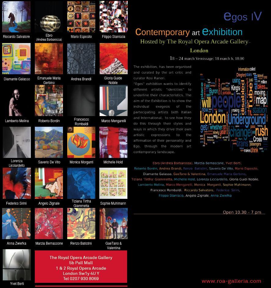 Mostre, Regno Unito, London, 18 March 2013 Dal 18 al 24 marzo 2013 parteciperò alla Mostra Internazionale d'Arte Contemporanea EGOS IV alla Royal Opera Arcade Gallery di Londra -Pall Mall Street-Sw1y4UY-United Kingdom Inserito 12 anni fa 0 Mi piace Non piace più 13 Commenti 80 Visite Condividi Facebook Twitter Google + Inserisci commento Commenti 12 12 anni fa Viváine Rebouças Artista Complimenti! 12 anni fa Elena Colusso Artista Complimenti e in bocca al lupo! 12 anni fa Associazione Roberta Smedili Istituzione un grande in bocca al lupo 12 anni fa fabio capitanio Artista complimenti e buona fortuna 12 anni fa samanta valente Artista Complimenti!!! 12 anni fa Lucia Ghirardi Artista Congratulazioni vivissime! LUCIA GHIRARDI 12 anni fa Marianna Merler Artista complimenti! 12 anni fa benny Artista complimenti 12 anni fa Rudolf Lichtenegger Artista Complimenti! 12 anni fa Gianpaolo Marchesi Artista Complimenti! vedi tutti i 13 commenti Inserisci commento E' necessario effettuare il login o iscriversi per inserire il commento Login