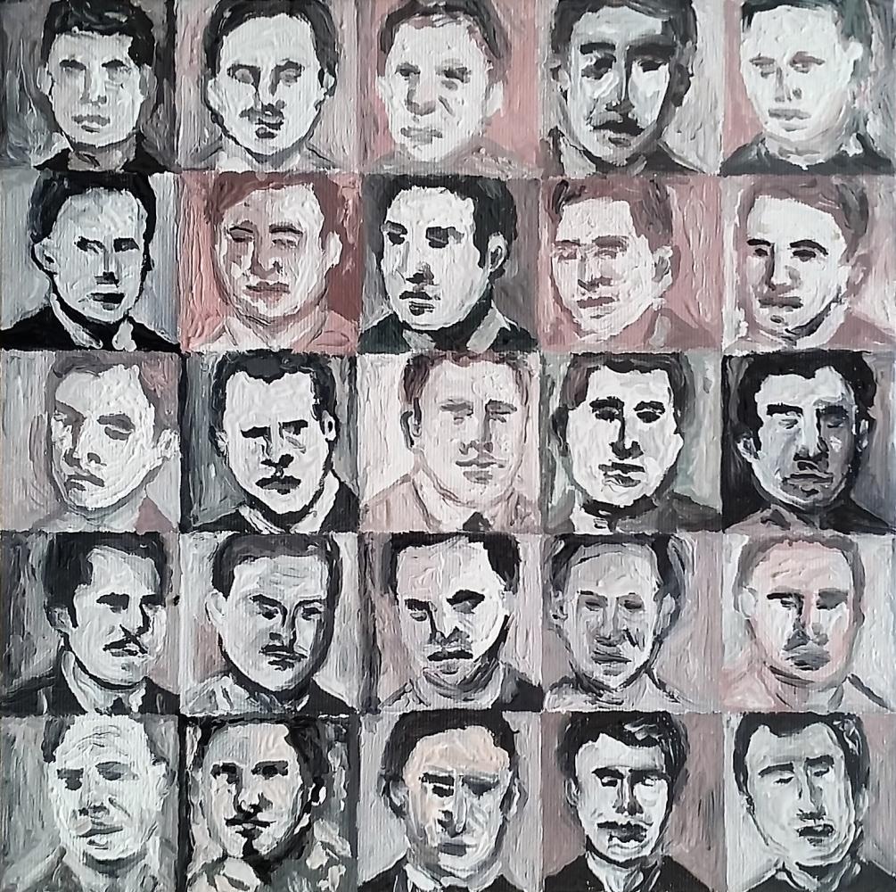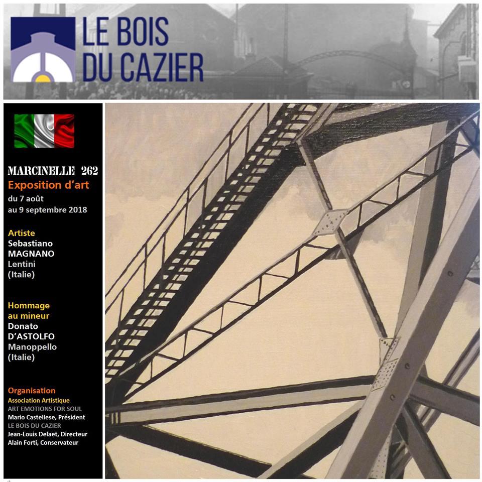 L’opera di Sebastiano Magnano per la collettiva “Marcinelle 262” 2018 rispecchia lo stile e il linguaggio espressivo proprio all’artista, che declina la figurazione pop con un trattamento della materia pittorica di stampo informale e gestuale e un chiaro contenuto di denuncia sociale, ripercorrendo la tragedia della miniera Bois du Cazier, dando rilievo ai volti degli scomparsi. Un’ideale epigrafe in cui morfosintatticamente e semanticamente i volti affiorano e si fondono, assumendo fisionomie evanescenti, confuse nella memoria, dissolte dalla pennellata che scava solchi nel grigio monocromo del fondo.