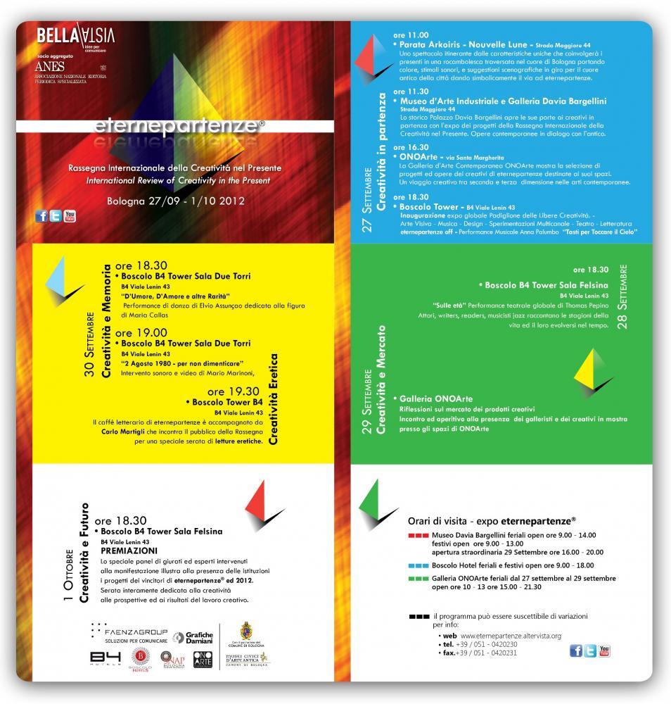 Siamo lieti di comunicare a tutta la comunità di creativi che segue "eternepartenze" il programma completo delle giornate della Rassegna con tutti gli incontri contenuti in agenda ed il percorso speciale tra Arti Visive, Teatro, Design, Musica, Sperimentazioni Multicanale e Letteratura...tutti gli appuntamenti sono ad ingresso gratuito! vi attendiamo a Bologna