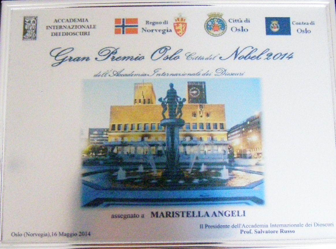 Ho ricevuto il Gran Premio Oslo Città del Nobel 2014 dell’Accademia Internazionale dei Dioscuri, che verrà consegnato a Roma il 31 maggio 2014 alle ore 16,00 presso il Cento Congressi “Hotel Hermitage”, sito in Via Eugenio Vajna, 12, Zona Parioli, alla presenza di rappresentanti dell’Ambasciata, di giornalisti, operatori culturali, personaggi dello spettacolo e delle autorità locali. Grande risalto all’evento sarà dato attraverso la stampa, la radio e la televisione.