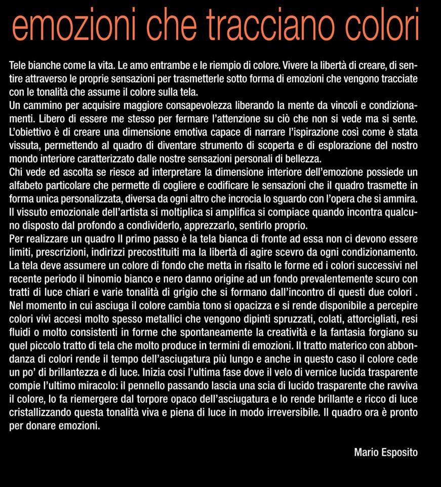 Terza Mostra personale di Mario Esposito presso la galleria d'arte Baccina 66. La mostra è curata dal gallerista Marco Dionisi e vedrà la partecipazione straordinaria del Maestro Adriano Fida. Dal 21 settembre al 2 ottobre dalle 15,30 alle 21 sarà possibile visitare la mostra ed incontrare l'artista. La galleria si trova in via Baccina 66 una traversa di via dei serpenti a due passi dal Colosseo e dai Fori Imperiali nel pittoresco Rione Monti. 21 Settembre vernissage ore 18.30.