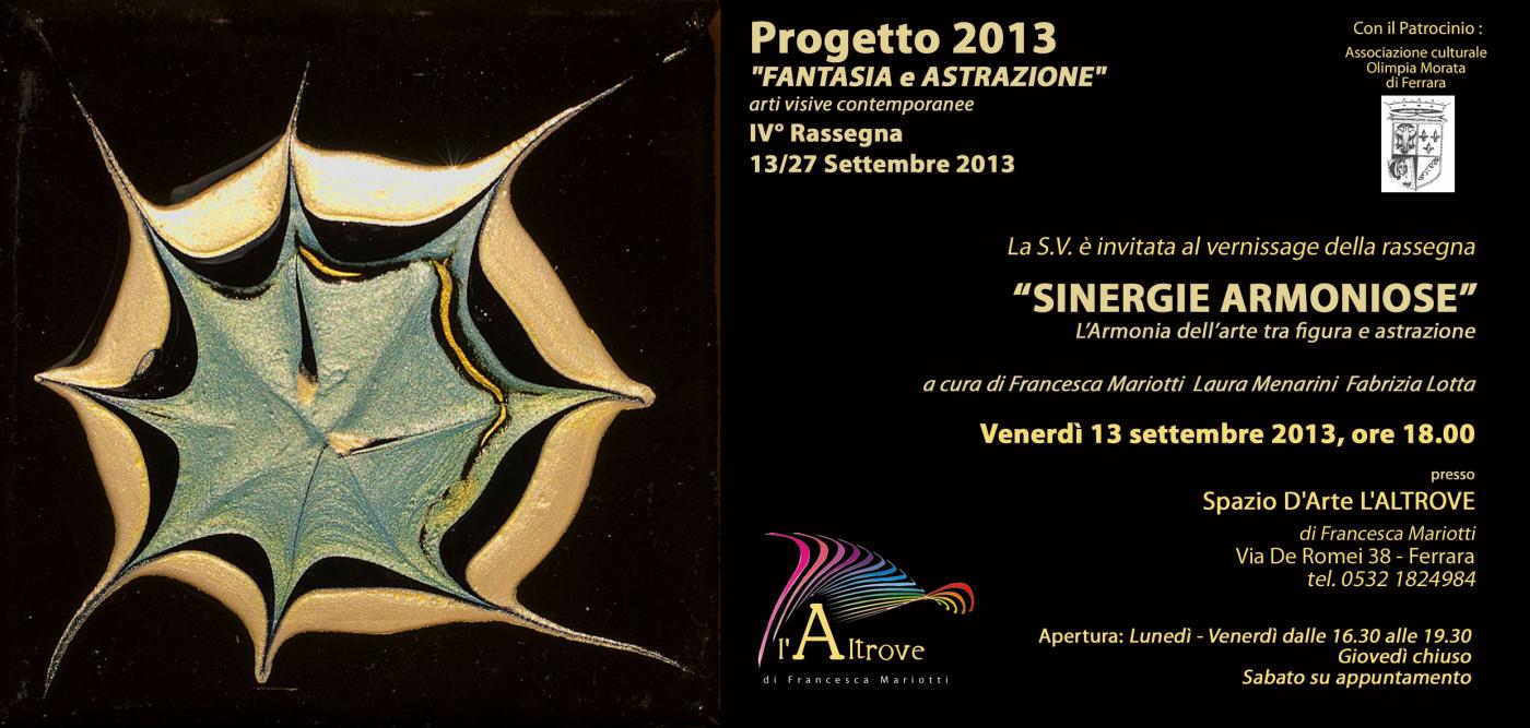 Venerdì 13 Settembre 2013, ore 18.00 vernissage della rassegna " SINERGIE ARMONIOSE" L'armonia dell'arte tra figura ed astrazione. A cura di Francesca Mariotti Laura Menarini Fabrizia Lotta. Presso Spazio D'Arte L?ALTROVE Via De Romei 38 - Ferrara