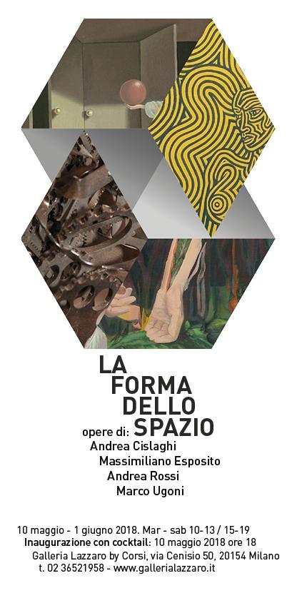Se lo spazio ha utilità di chiarezza visiva, esso può anche essere, ed è, un valore. La Forma Dello Spazio getta una luce sul suo valore estetico. Gli artisti presenti—Cislaghi, Esposito, Rossi, Ugoni—dedicano una attenzione particolare alla strutturazione visiva (e fisica), delle loro opere. Nelle loro figurazioni essi hanno un modo personale di ‘narrare’ lo spazio, facendone avvertire la presenza in maniera forte. Ora liquido (Rossi) ora grafico-geometrico (Ugoni), in alcuni casi con il rigore di prospettive spesso vertiginose (Esposito), in altri fino a frangersi affilato in piani metallici (Cislaghi), lo spazio dei quattro artisti rivendica un ruolo da protagonista nel loro discorso artistico.