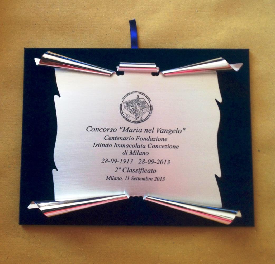 La mia opera ha vinto il 2 premio, mi hanno rilasciato un attestato in pergamena, una targa in argento e una medaglia in bronzo.