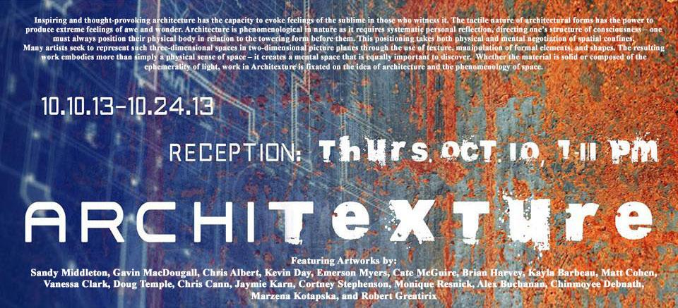 Architexture is a contemporary group art exhibition that explores the phenomenology of space, and tactility of structure and form. Whether the material is solid or composed of the ephemerality of light, work in Architexture is fixated on the idea of architecture and the phenomenology of space.
