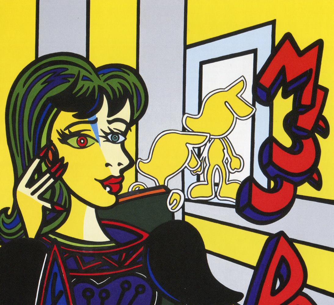“…Così come nel secondo dipinto tratto dall’omonima opera di Picasso, “Dora Maar seduta”, del 1937, che ne riprende pari pari l’impianto, ma lo rivista con gli stilemi pop di Roy ed con un layout più contemporaneo. Lei, nata come Henriette Theodora Markovitch, era una fotografa, pittrice e poeta croata, naturalizzata francese che assunse lo pseudonimo di Dora Maar, conobbe Picasso nel 1935 e per anni fu la sua musa.”
