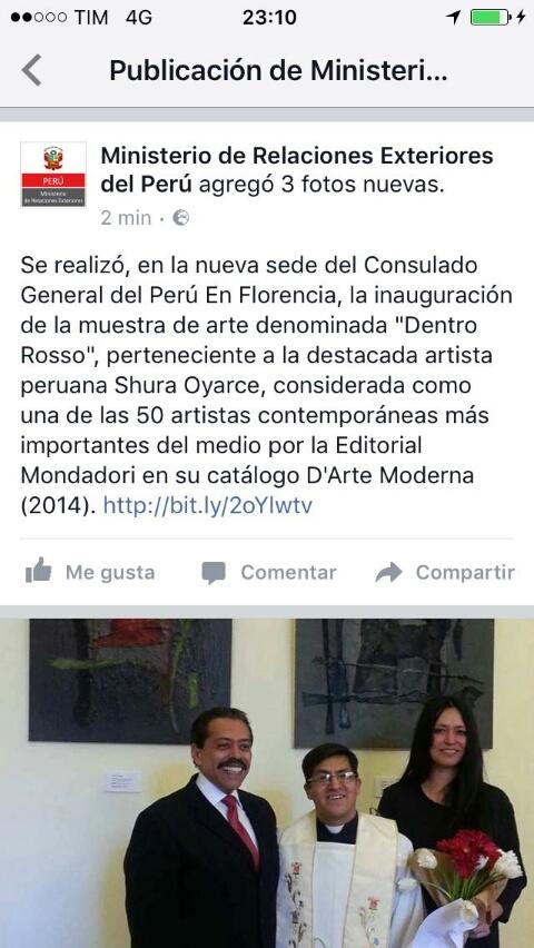 Mostre, Firenze, 31 March 2017 Mostra personale presso il Consolato Generale del Perù a Firenze Inserito 8 anni fa 4 Mi piace Non piace più 5 Commenti 68 Visite Condividi Facebook Twitter Google + Commenti 5 8 anni fa Tanya Bartolini Premium Artista Congratulazione vivissime e un grandissimo in bocca al lupo ... un abbraccio grande grande !!!! <3 8 anni fa Teresa Palombini Artista Auguri!! 8 anni fa Alessandro Lonzardi Artista Tantissimi complimenti! 8 anni fa Matteo Lucente Artista Complimenti! 8 anni fa Cat Fotografo Felicitaciones!!!! Inserisci commento E' necessario effettuare il login o iscriversi per inserire il commento Login
