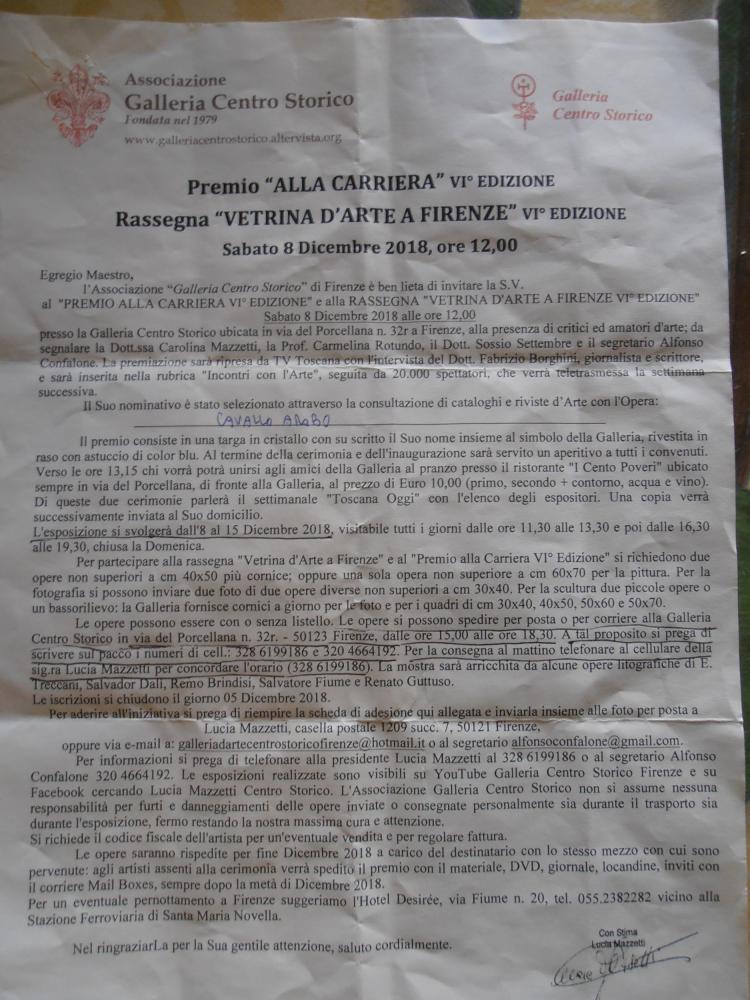 Ricevuto Premio alla Carriera 2018 per meriti conferiti nel campo dell'arte e della cultura da Ass. Galleria Centro Storico Via del Porcellana n.32r Firenze
