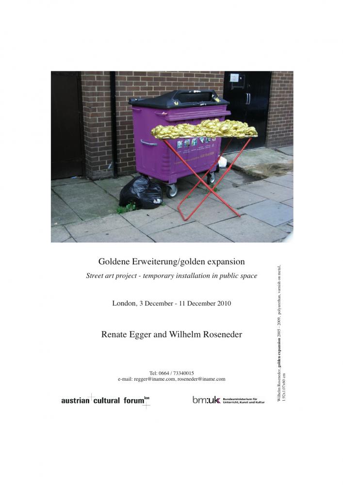 Mostra, Regno Unito, London, 11 December 2010 Competenze: Collezionista Project by Renate Egger and Wilhelm Roseneder. Goldene Erweiterung/Golden expansion. Street art project - temporary installation in public space around London, UK, December 2010. Austrian Cultural Forum London, Cultural Ministry of Austria http://eggerrosenedercontemporary.com Partecipa al Project 13 anni fa 0 Mi piace Non piace più 0 Commenti 99 Visite Condividi Facebook Twitter Google + Commenti 0 Inserisci commento E' necessario effettuare il login o iscriversi per inserire il commento Login