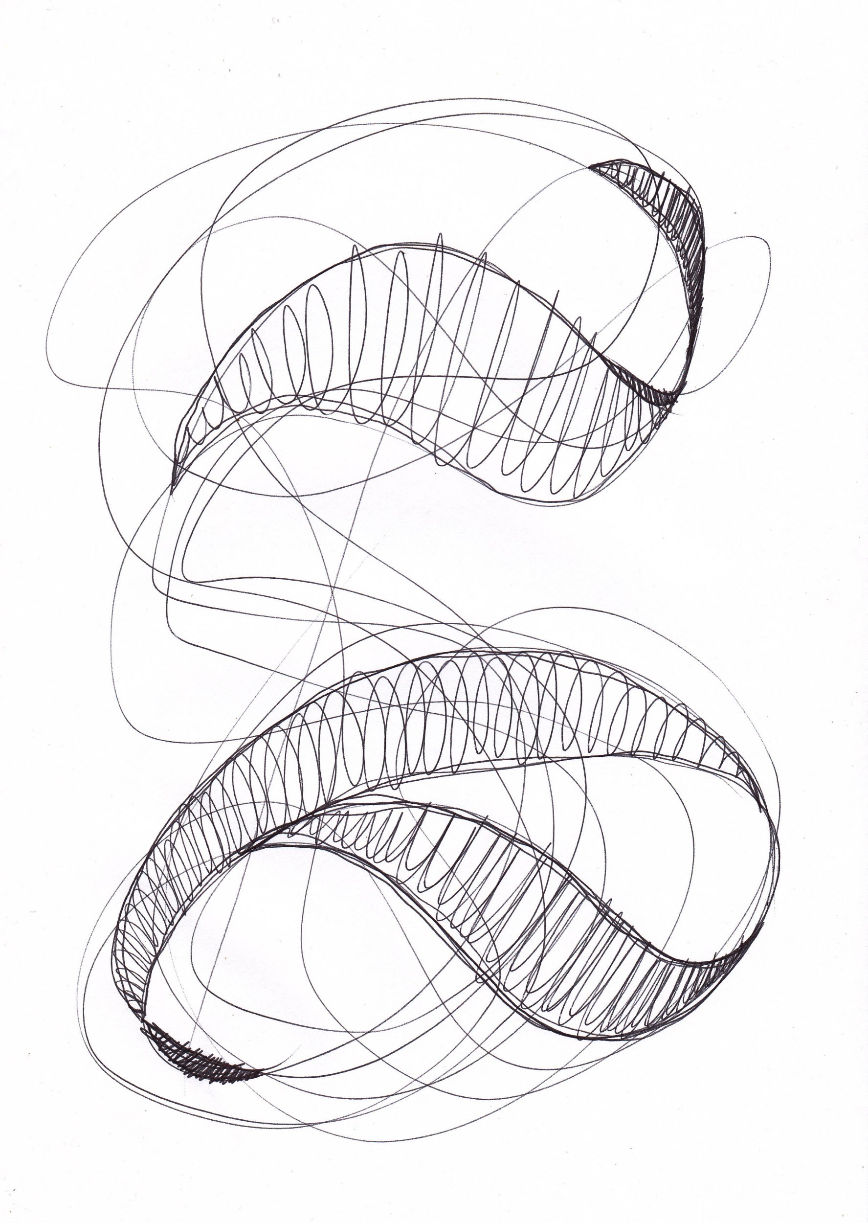 Disegni che portano dentro di sé l'energia di questo dinamismo, tratti istintuali che diventano spirali, che creano piani che si sovrappongono a dar vita a geometrie matematicamente inesistenti ma che illusoriamente potrebbero anche esistere, in primis evocando la loro esistenza nella mente di chi guarda.