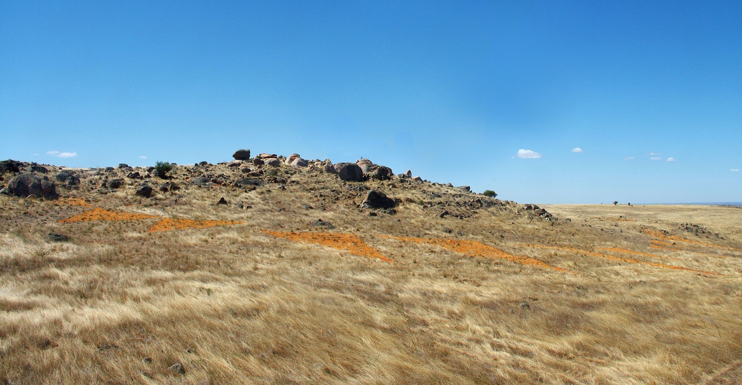 This work is made for the Palmer Sculpture Biennial 2010. It is a colour and space concept in the mountains “Flinders Range” in S-Australia near Adelaide. The material is red and yellow sand of this region. The size is approximately 130m long and 75m wide. The work goes around a peak of a higher pinkish granite hill and situated on an arid area near the little village Palmer. It will disappear after some time with the strong winds and winter rains. Here the mountain becomes the sculpture.