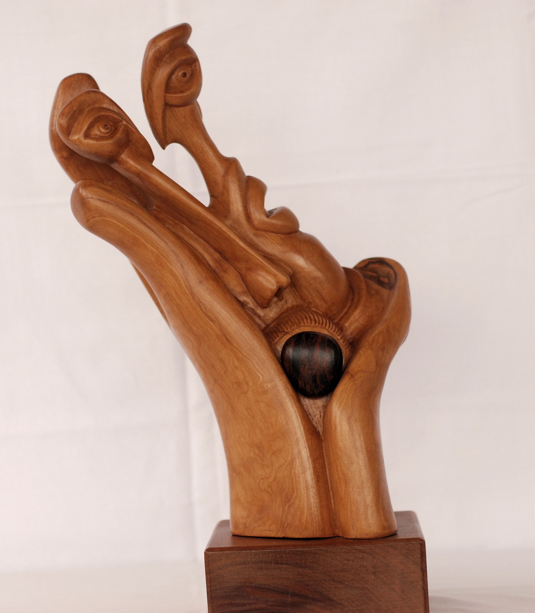 Scomposizione surreale di un viso scolpito su di una radica di olivastro su cui viene incastonata un'ossidiana mogano levigata finemente a simboleggiare il cuore umano.