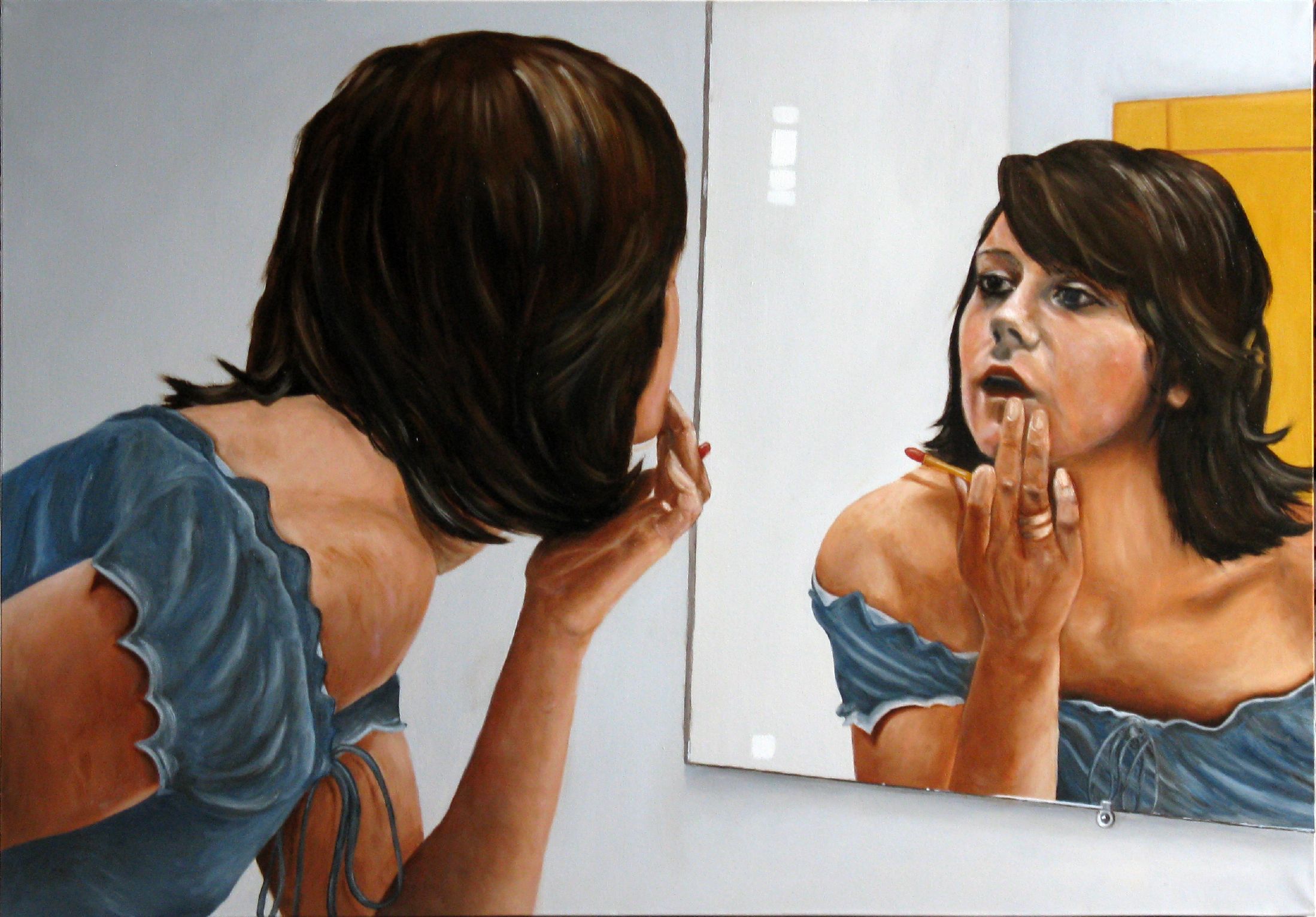 Cos'è che davvero colpisce in questo lavoro? -una sorta di gioco postmoderno:dove la "realtà "- della rappresentazione dipinta- subisce una sorta di ulteriore scacco semiotico che apparentemente ne rafforza ,attraverso la sua ri-flessione (similulazione del reale attreverso lo specchio), una sua "apparente" messa in scena del reale -che in realtà è pura utopia distonica -perchè in realtà ne raddoppia l'inganno( linguistico) e ci riporta all'inizio....