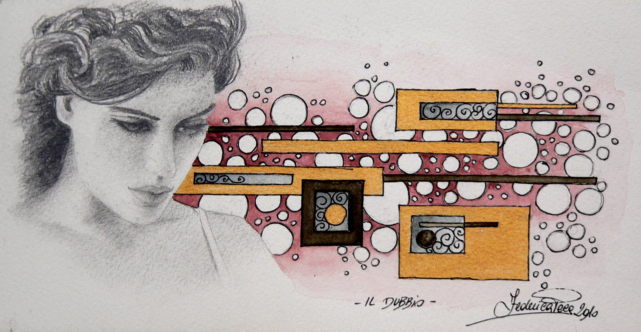 Disegno a matita 2b, acquarello,penna gel,acrilico oro.