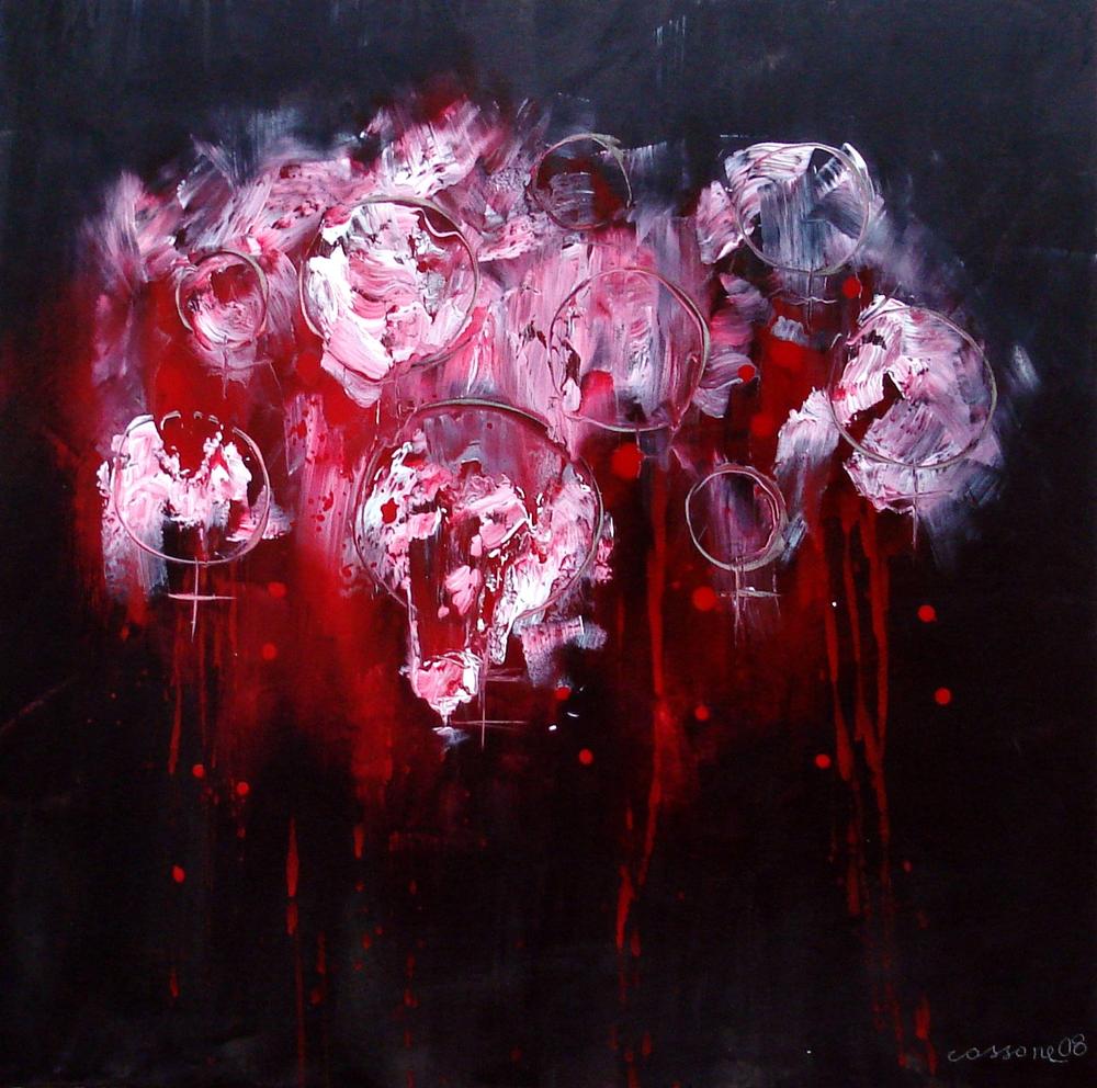 Il dipinto rappresenta la situazione cui è sottoposta la donna nella sociatà internazionale di oggi, soggetta maltrattamenti psicologici e sici, allo Stolking e al Mobbing familiare.Nello sfondo scuro, “sporco”, circondate da rivoli e macchie rosse ( sangue, dolore, sofferenza, sacrificio), le donne vengono rappresentate dal simbolo (cerchio con crocetta in basso) di colore rosa figure tormentate.
